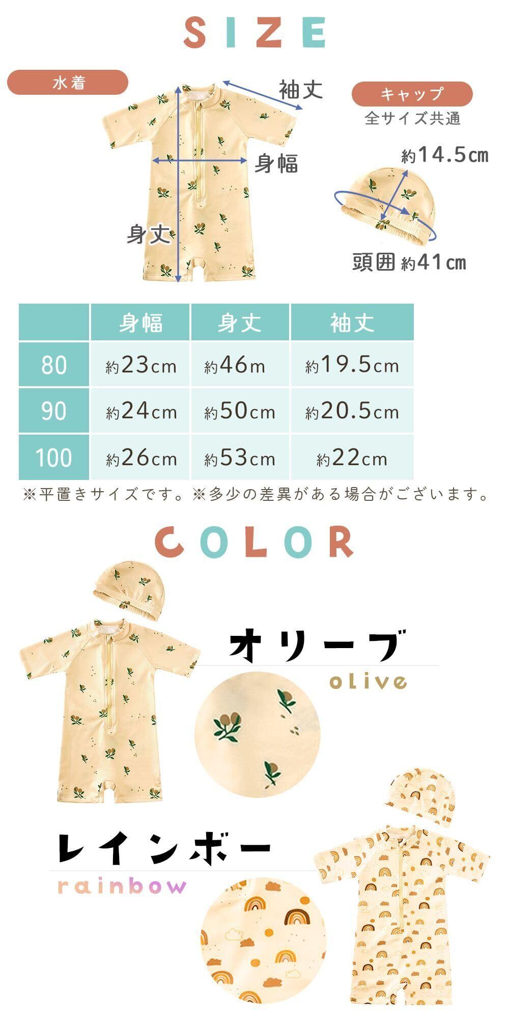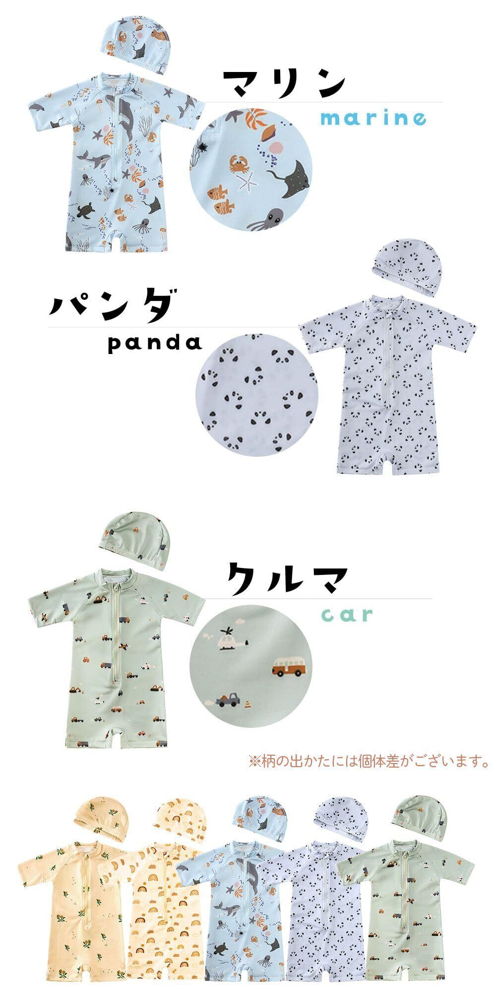 【紫外線対策もばっちりなUVカット水着】 可愛いだけじゃない、しっかり機能性もあるベビー用水着。紫外線測定器を用いて実証済み、最大99.0%のUVカット率で、お子さまの繊細な肌を日差しから守ります。オリーブ、レインボー、マリン、パンダ、クルマなど多彩なデザインから選べるので、男女問わずおしゃれに決まる水着。キャップ付きで頭部の日よけ対策にもぴったり。夏のプールや海水浴、おうちプールなどの外遊びがもっと快適に!80cm、90cm、100cmの3サイズ展開で、お子さまの成長に合わせて選べます