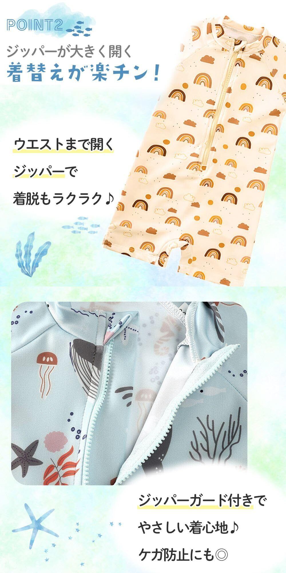 【前ファスナーで着脱簡単&ジッパーガード付き】 ママやパパの着替えもラクにできる、前開きジッパー仕様。ウエスト部分まで大きく開くから、濡れた状態でも脱がせやすく、時間のないお出かけ時にも便利。ジッパーガードがついているので、赤ちゃんの肌に直接当たらず安心設計。やさしい着心地と安全性を両立したディテールがうれしい。簡単に着替えられる構造は、水遊びのあとのストレスを軽減してくれます