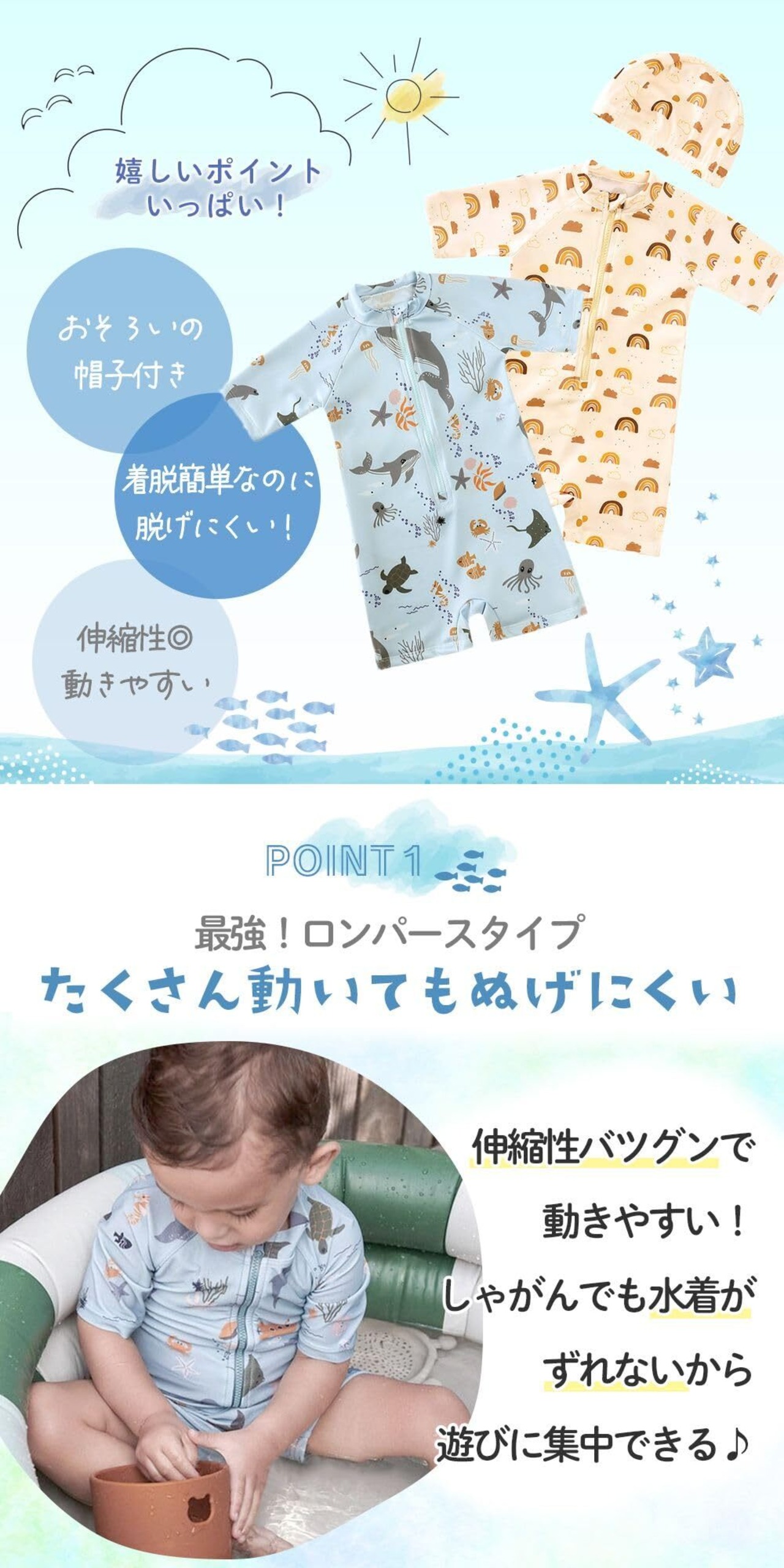 【ロンパース型でずれにくく脱げにくい構造】 活発に動き回る赤ちゃんでも安心のロンパースタイプのベビー水着。伸縮性抜群で着心地がよく、しゃがんでもズレずにしっかりフィットするから、遊びに集中できる仕様です。背中までしっかり覆う形状なので、体温が下がりにくく、水遊び中も体を冷やしにくいのが嬉しいポイント。ベビー用スイムウェアとしても人気で、初めての水着デビューにもおすすめです
