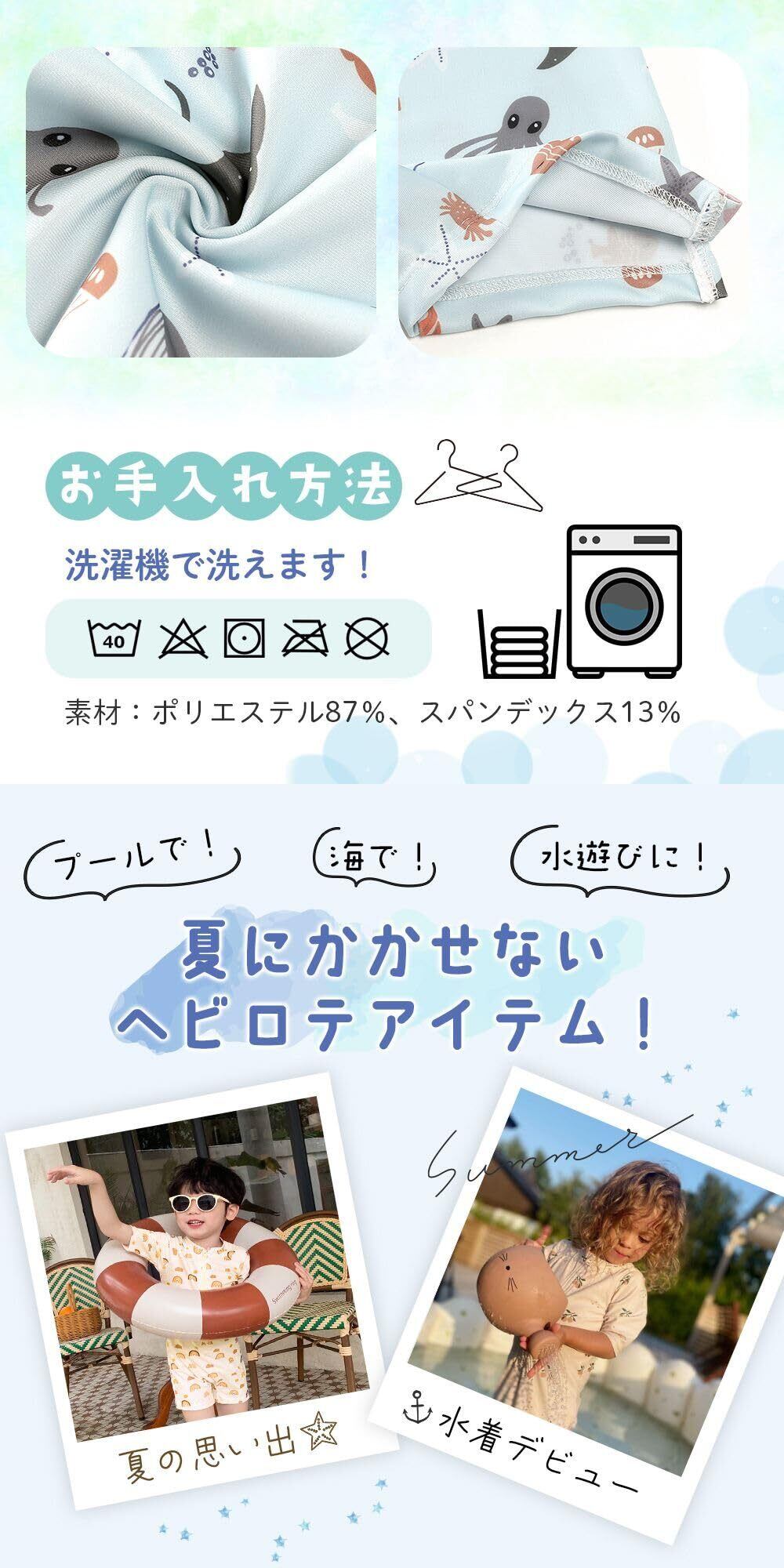 【洗濯機で洗える&柔らか素材で快適】 素材はポリエステル87%・スパンデックス13%で、水を含んでも乾きやすく軽量。洗濯機でそのまま洗えるから、ママにもうれしいお手入れ簡単仕様。海水や塩素にも比較的強く、何度使ってもへたらない丈夫さが魅力。赤ちゃんの肌に優しい柔らかい生地で、着心地抜群。プールやビーチで汚れても、簡単に洗ってまた使えるから、夏のアウトドアシーンにぴったりなベビーアイテムです