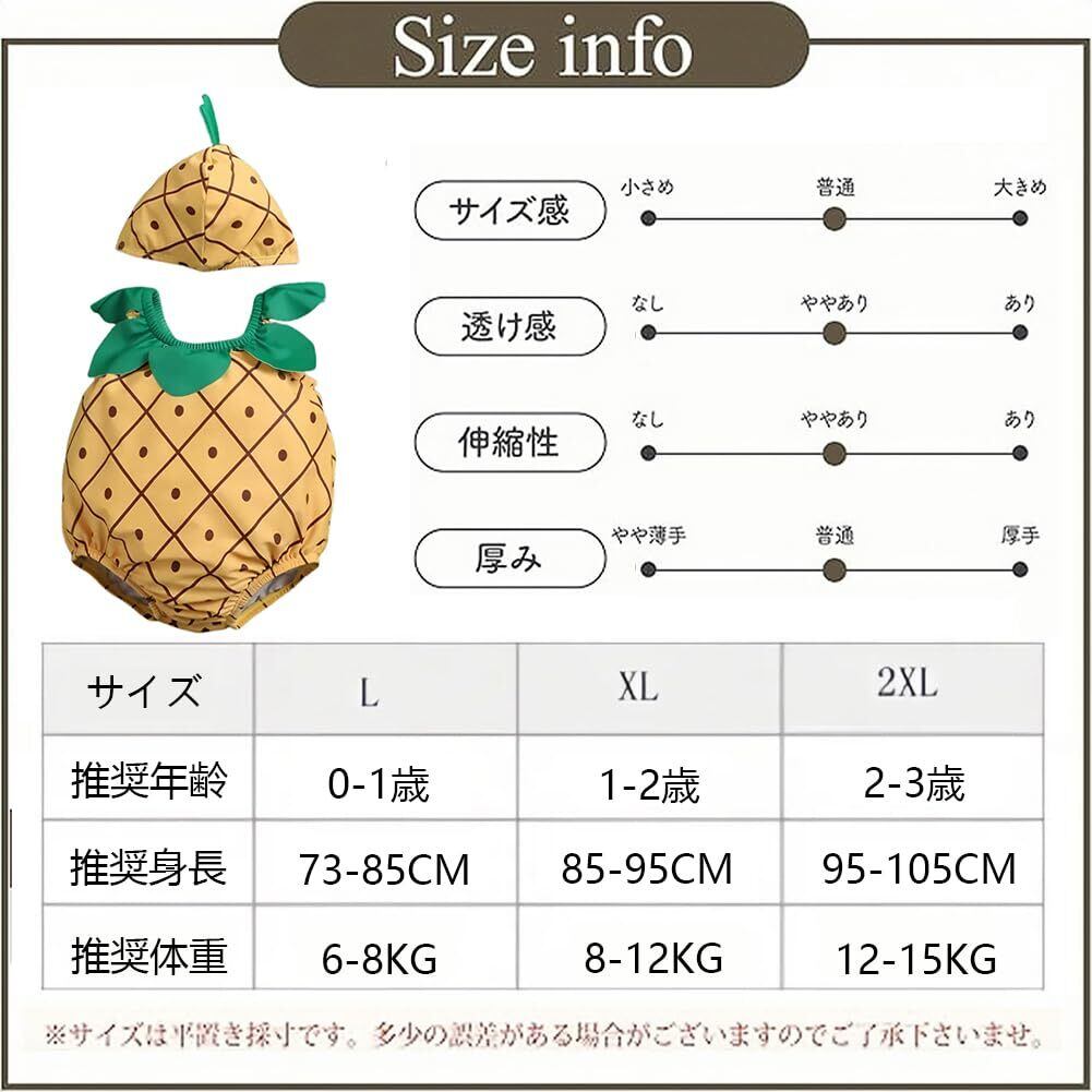 【商品内容】セット内容は2点セット:ファスナー付きのフルーツ水着・水泳帽子。サイズは75(65-75CM)、85(75-85CM)、95(85-95CM)があり、注:以上のは標準的な子供サイズで、太ったベビーはぜひ大きいサイズを選びください。主に体重に参考して購入することをお勧め、年齢はあくまで参考です。