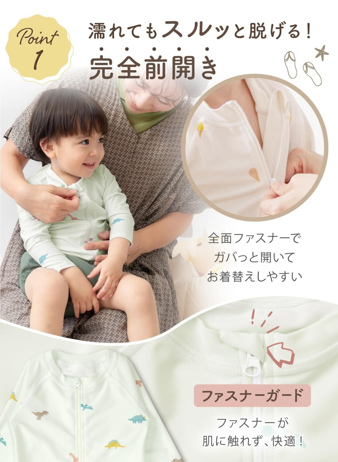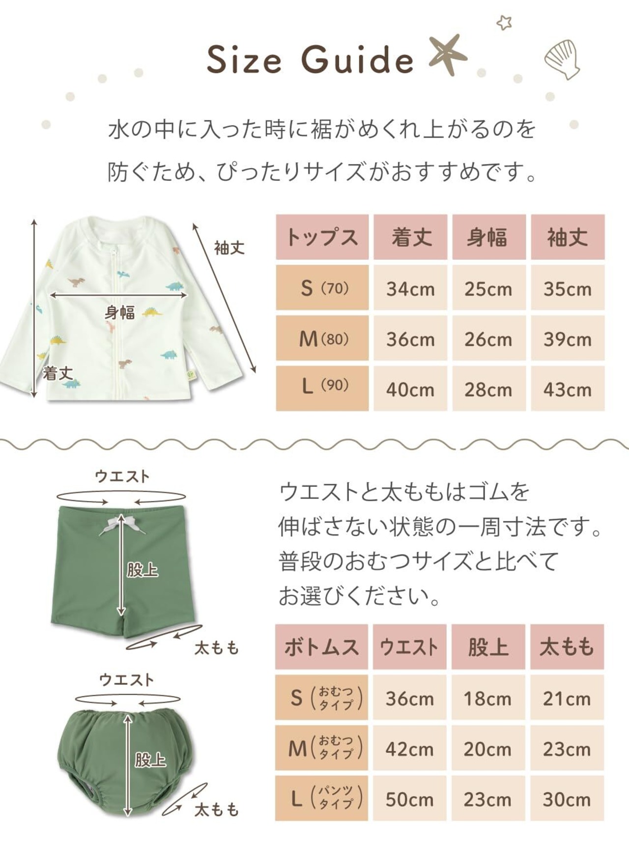 【ボトムスは選べる2種類】 SとMサイズは、おむつ機能を搭載! おむつタイプは3層構造のなっていて、水遊び中におしっこをしてしまってもしっかり吸収して漏れません。外側は通常の水着と同じはっ水生地を採用しているので、水遊びで使用している水が中まで染みる心配はありません。水遊びパンツとしてご利用いただけます。また、おむつを卒業した2・3歳にぴったりなLサイズはパンツタイプ。内側はメッシュ生地が付いているので、お腹を冷やしません。サッと着られるので「自分で着替えたい」キッズにもぴったりです。