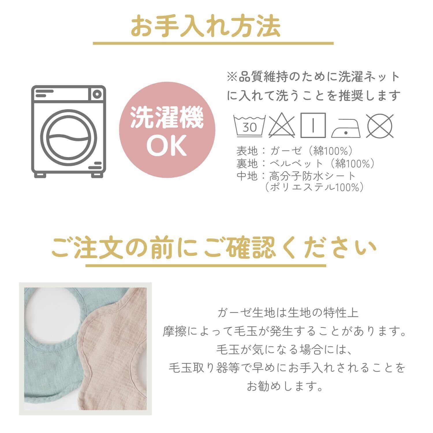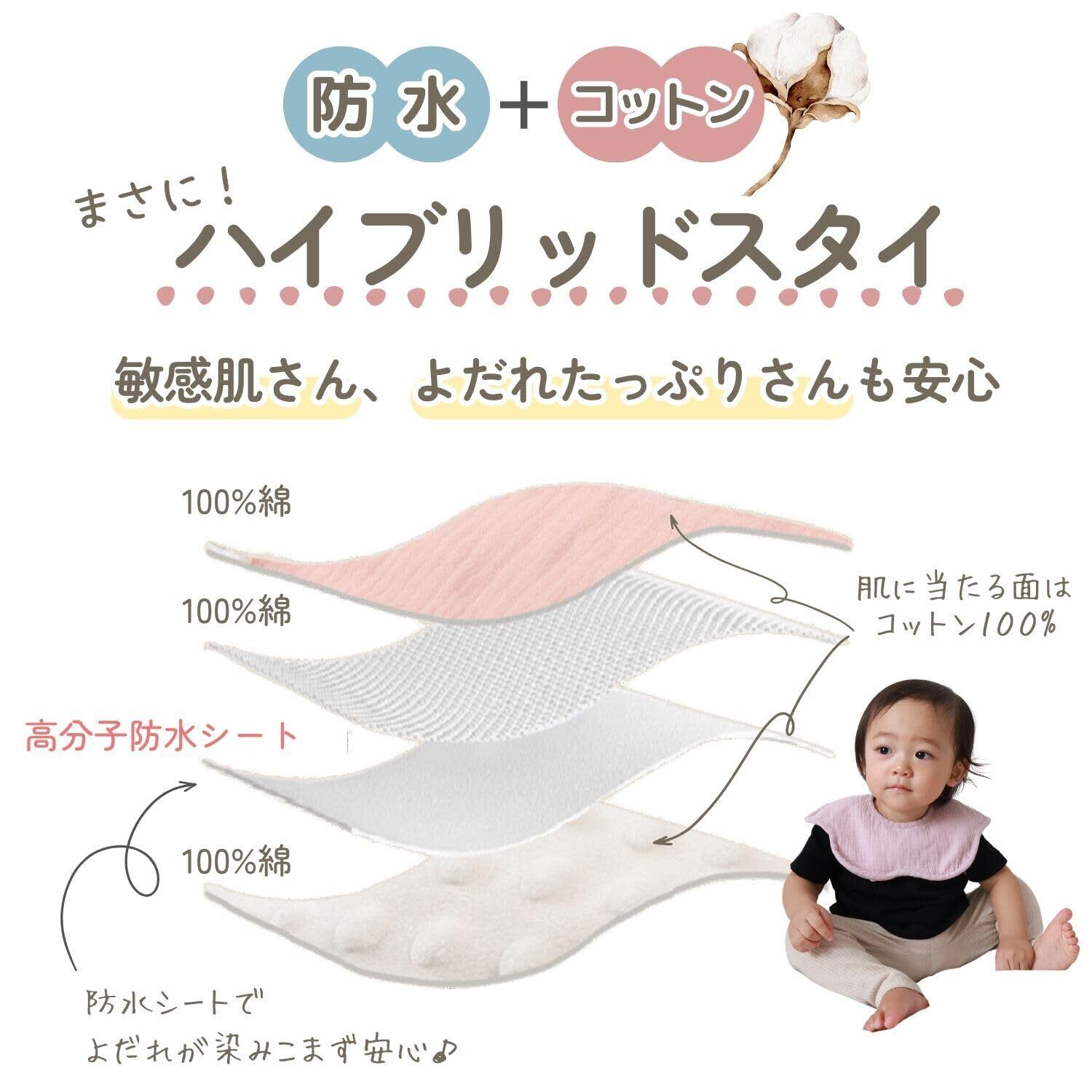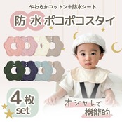 コットン&防水シートの4層構造・・・肌に触れる表面は赤ちゃんに安心なコットン100%、吸水性に優れたダブルガーゼを使用。内側には高分子超防水シートを使用しているので、沢山のよだれもキャッチ。お洋服が汚れてしまう心配がありません。裏は凸凹感のある特殊素材で、ふんわりとした感触が繊細な赤ちゃんの肌にも安心です。表面生地はすべてコットンを使用、両面ご使用いただけます。