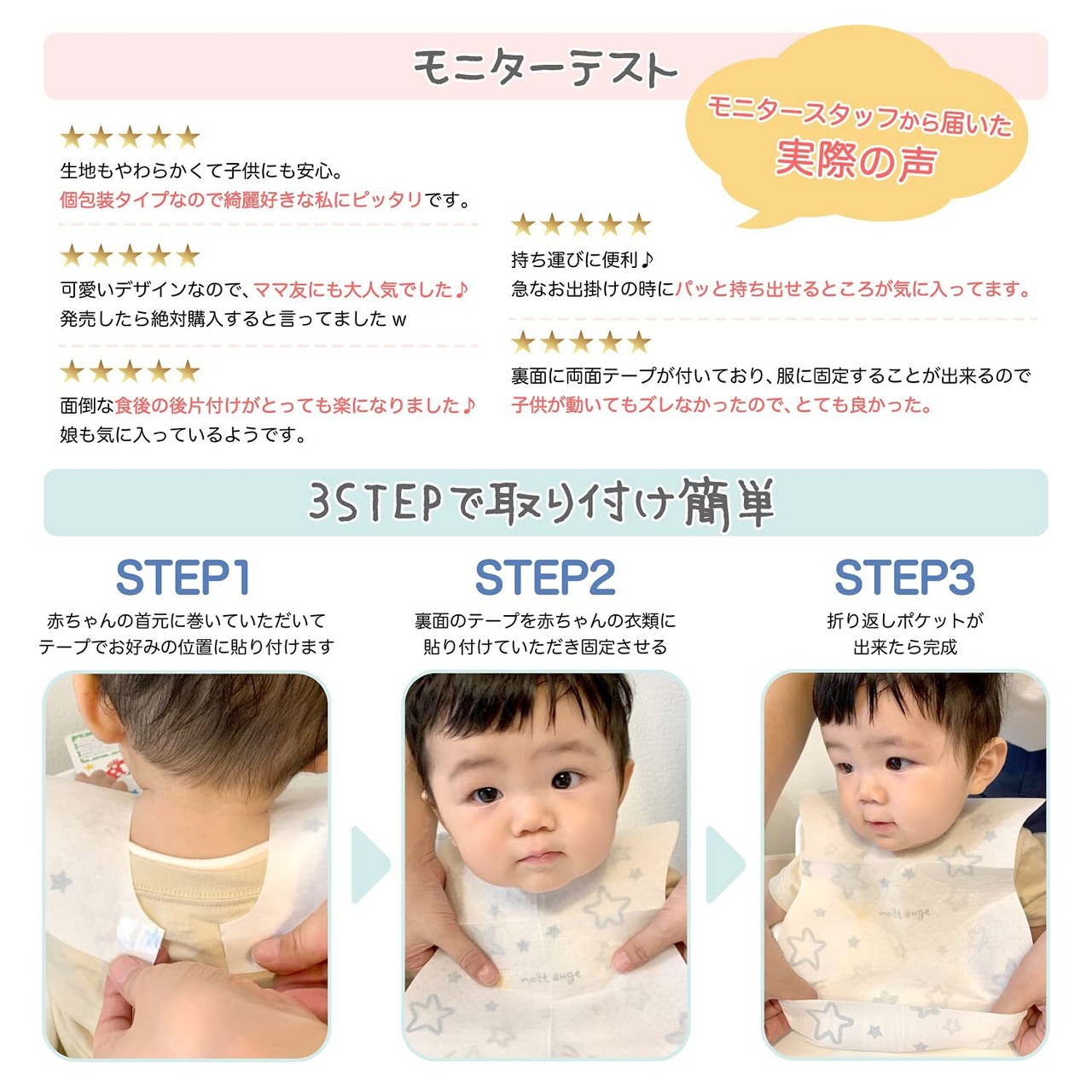 【両面テープで衣類に固定可能】首元と胸元には両面テープが施されておりますので、赤ちゃんが動いてもズレにくいように設計されております