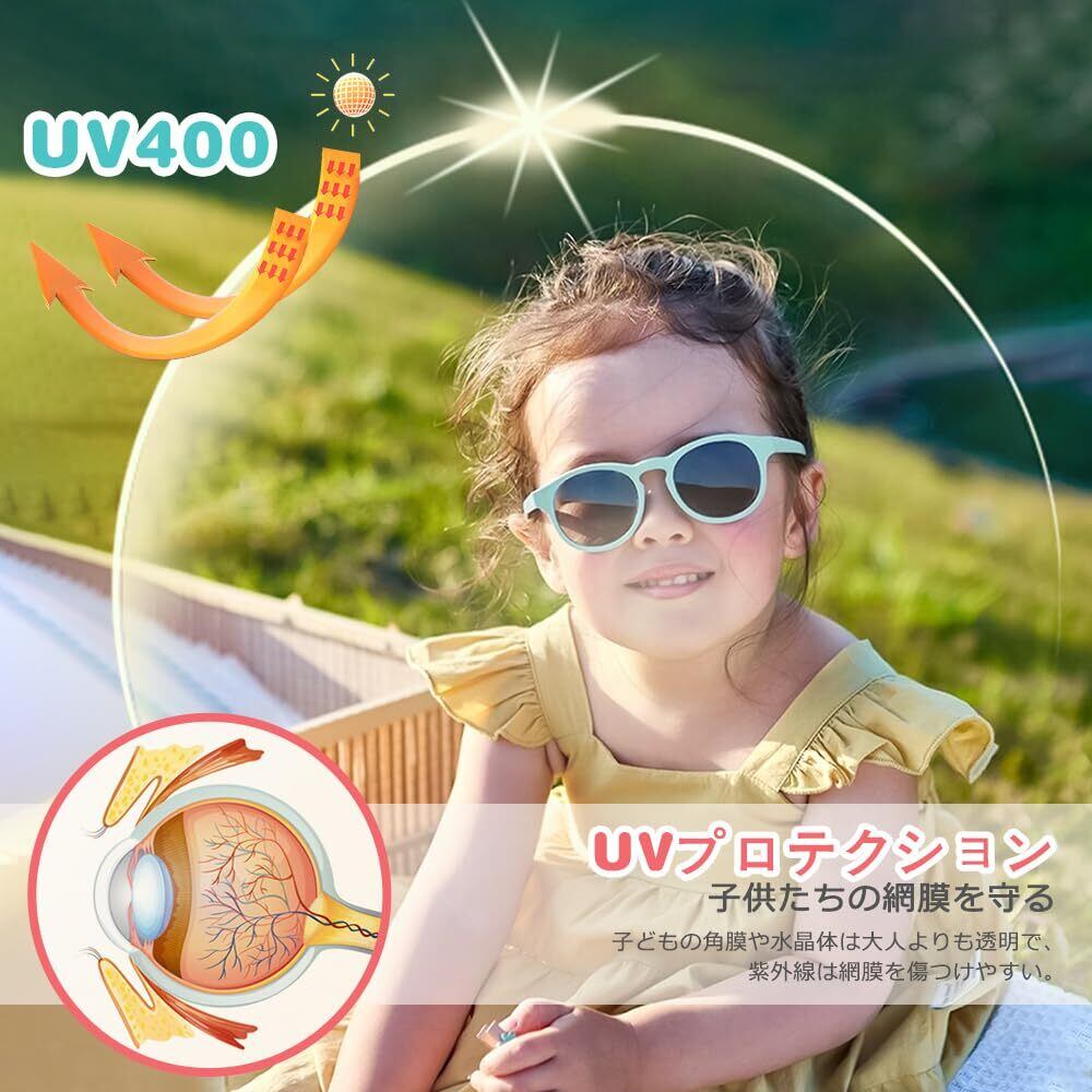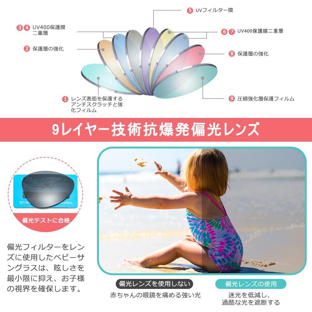 【UV400保護】 当社の偏光ベビーサングラスは偏光レンズを採用し、クリアな視界を提供し、UV400保護、UVAとUVB保護、日光の99%をブロックし、目と目の周りの柔らかい皮膚を保護し、太陽のまぶしさによるお子様の目の不快感を和らげ、目の疲れを軽減します。赤ちゃんは紫外線に敏感なので、良質なサングラスはお子様の目を守ります。