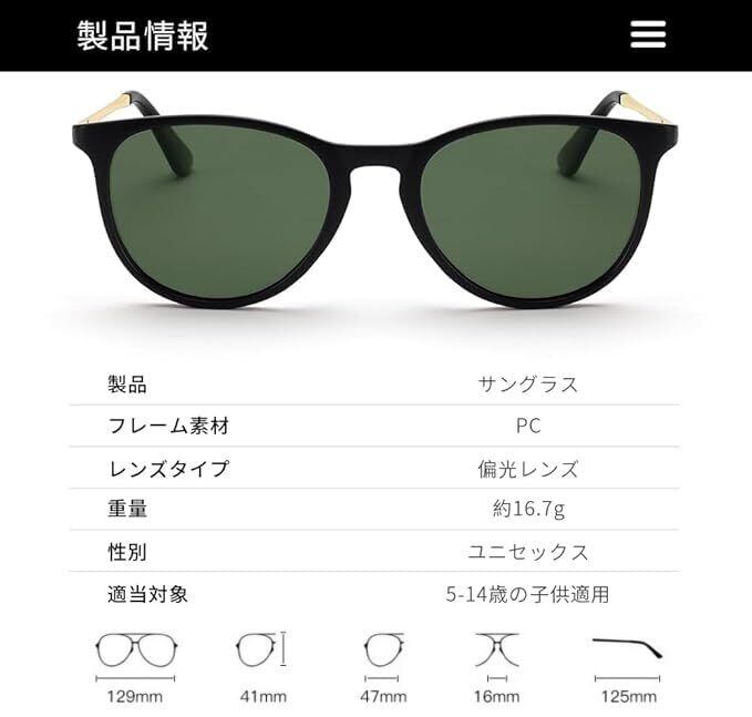 【サイズ】レンズのよこ幅:47mm レンズのたて幅:41mm ブリッジ幅:16mm 全体のよこ幅:129mm テンプルの長さ:125mm