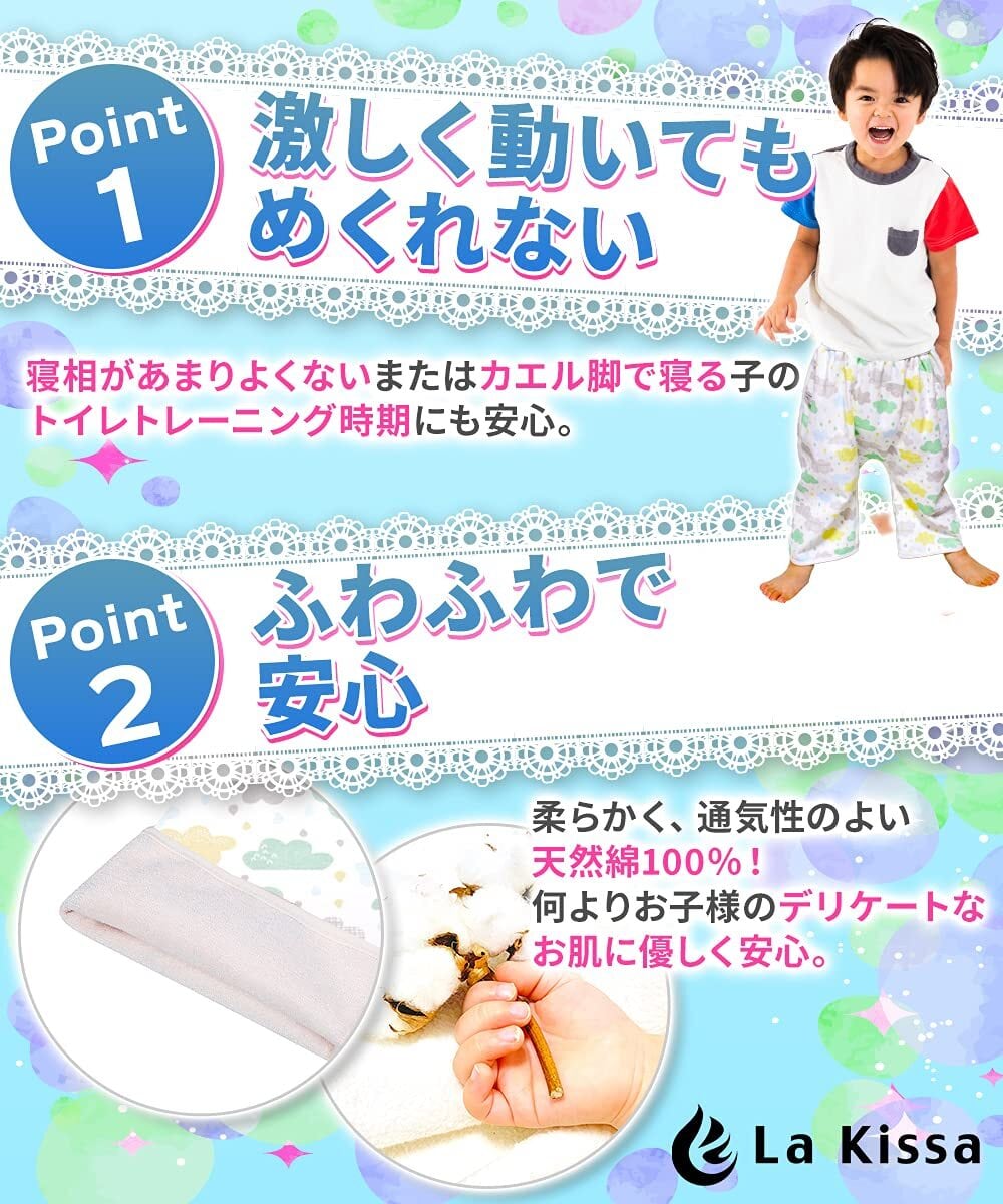 【ズボンタイプの特徴】寝相があまりよくないまたはカエル脚で寝る子など激しく動いてもめくれません。