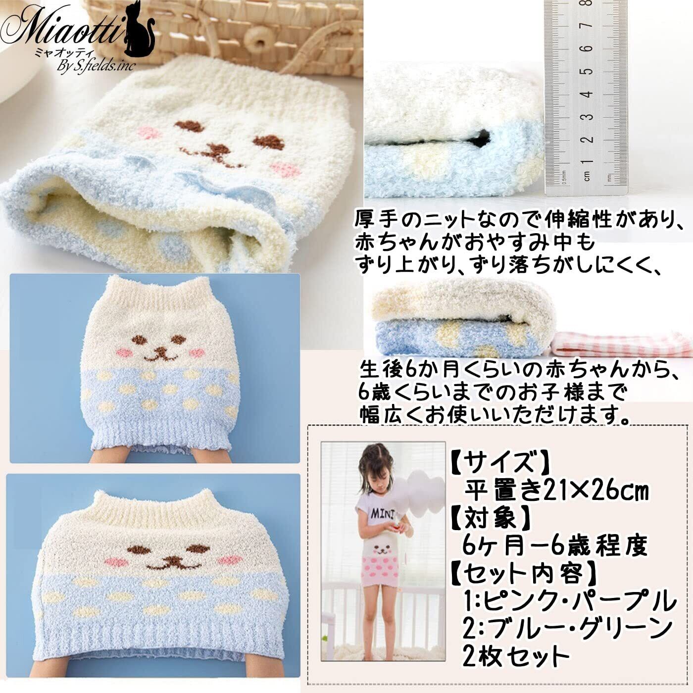 厚手のニットなので伸縮性があり、赤ちゃんがおやすみ中もずり上がり、ずり落ちがしにくく、生後6か月くらいの赤ちゃんから、6歳くらいまでのお子様まで幅広くお使いいただけます。