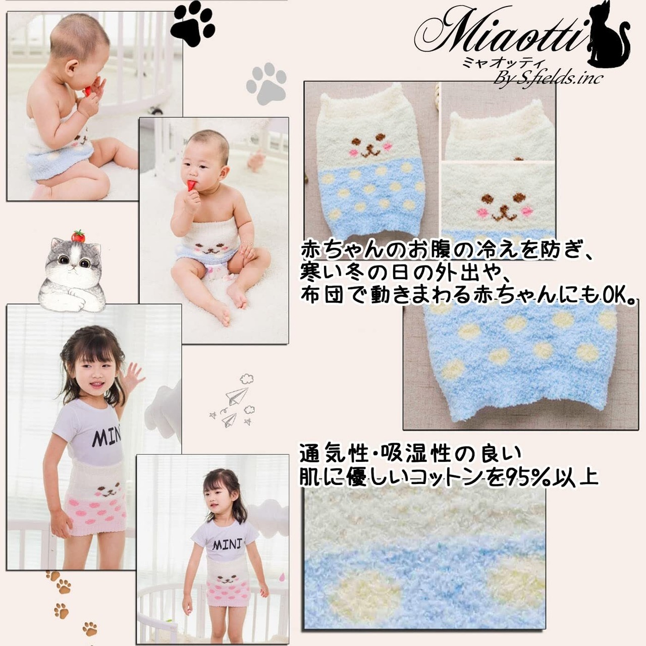 肌に優しいコットンを95%以上使用し、柔らかく伸縮性が有り、赤ちゃんのお腹にぴったりフィット。軽量で起きているときも長時間着用可。