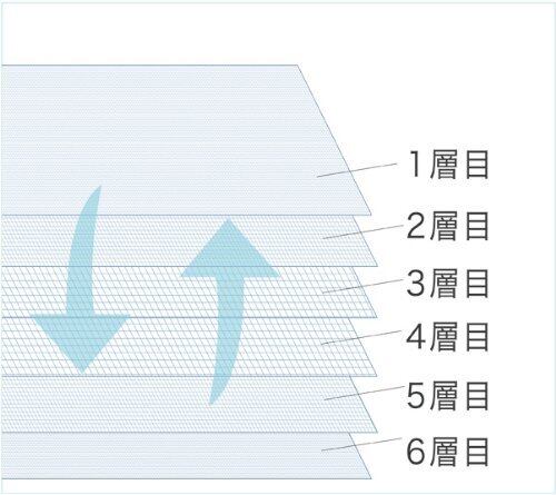吸湿性や発散性に優れた6枚重ねの編み目の異なるガーゼを使用しているので、夏は汗を素早く吸収し、冬は暖かい空気を逃がしにくい構造。