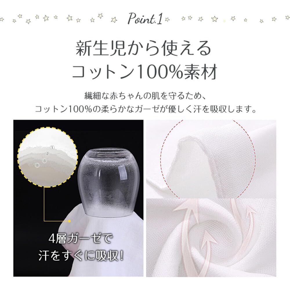 【純綿素材】:新生児から使える赤ちゃんに優しいコットン100%の4重ガーゼ素材で作られました。柔らかく肌触りがよく、赤ちゃんの繊細なお肌をケアします。サイズは20×40cm。0~4歳の子におすすめ。