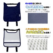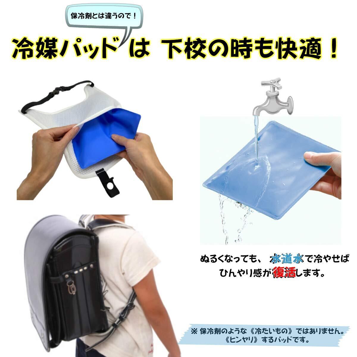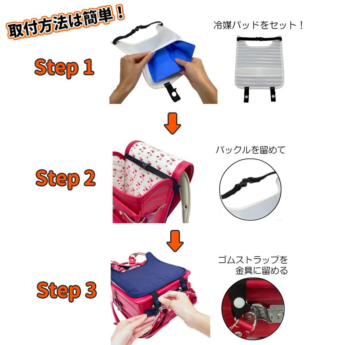 ランドセルに取り付けて、お子様の背中とランドセルの間の汗による不快感を和らげるパッド。暑い日の登下校中に汗で背中が蒸れるのを防げるので、ランドセルの汗染み防止にもなります。 表生地には吸水速乾性のある生地で汗を素早く吸水! 裏生地はハチの巣のような立体構造の「ハニカム」メッシュを使用しているので空気の通り道を確保でき、クッション性もありソフトな付け心地になります。 さらに、付属の冷媒パッドは体温より少し低い温度で結晶(つぶつぶ)から液状化し、その吸熱する力がひんやり感を持続させます。また、液状化した保冷剤は室温より高いので、吸熱した熱を空気中に放出して固体に戻る性質を併せ持つことからひんやり感をさらに持続させます。結晶は一度溶けてしまっても再び固体化するので何度でも熱吸収を繰り返します。 バックル付きゴムストラップをランドセル上部に取り付け、ホック付きのゴムストラップをランドセル下部金具に左右ともパチンと取り付けるだけ。 また、取り付けを裏表反対にすればリバーシブルになり、メッシュ生地を背中に当ててもご使用いただけます。