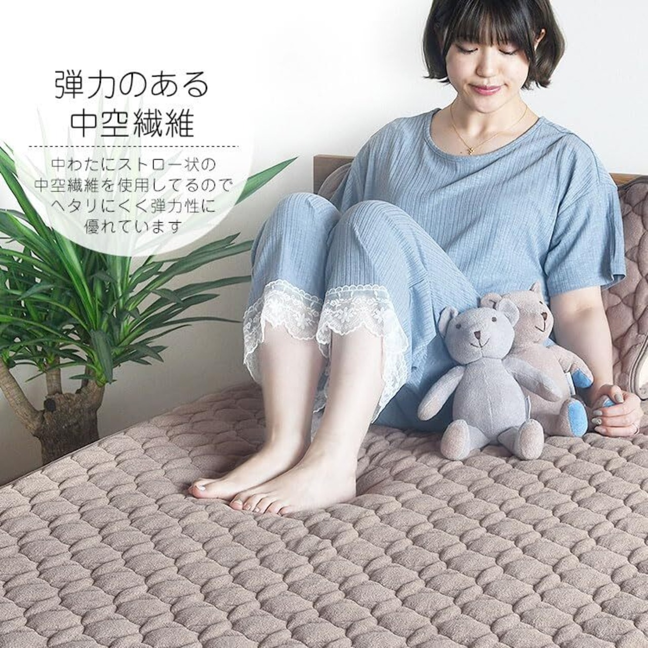 【弾力性と抗菌防臭効果のある中わた】中わたにはストロー状の中空繊維を使用しているのでヘタリにくく弾力性に優れています。抗菌防臭効果加工を施しているので、ニオイを抑えて快適お使いいただけます。さらに、ノンホルムホルムアルデヒドを使用していない為小さなお子様やベビーにも安心してご使用いただけます。