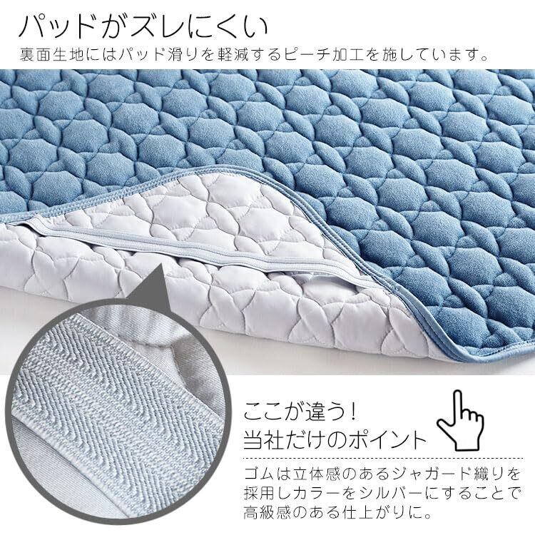 【滑り止め加工でズレにくい】裏面にある四隅のズレ防止ゴムはシルバー色のおしゃれなジャガードゴムを使用し、更に裏生地には、よりズレにくくするためのピーチ加工を施してありますので、マットレスや敷布団とのズレを防止します。