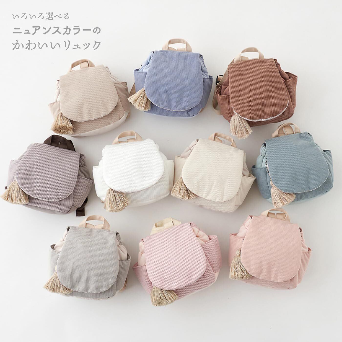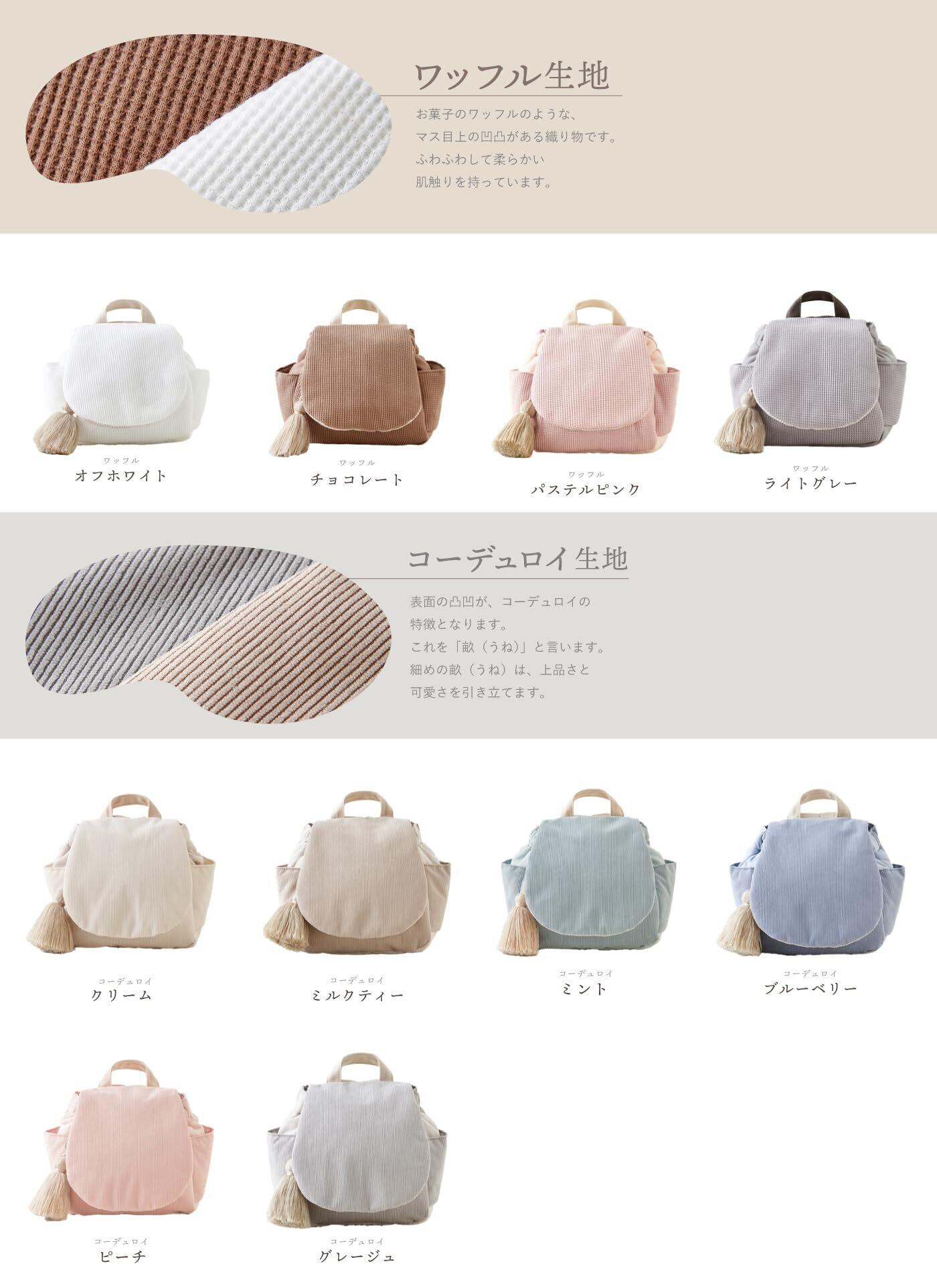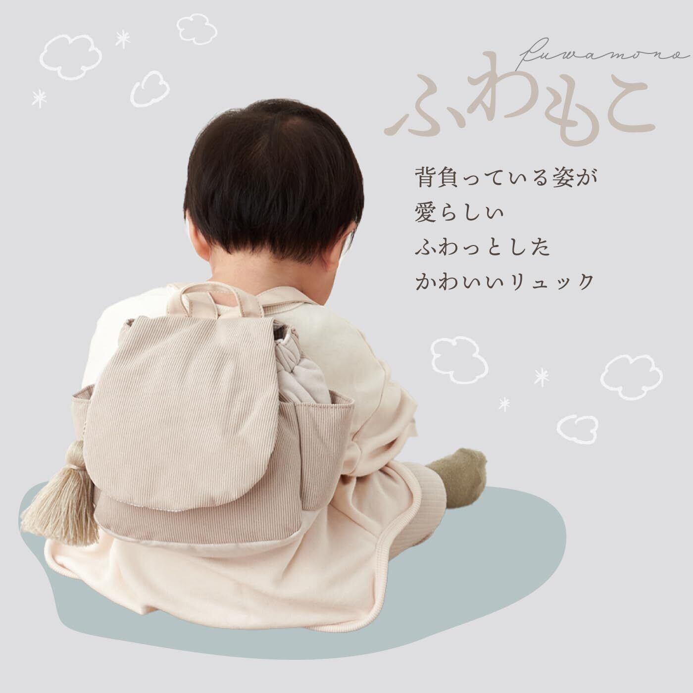 「ふわふわ」の素材感と「ころん」としたシルエットで赤ちゃんらしいリュックに仕上げました。
