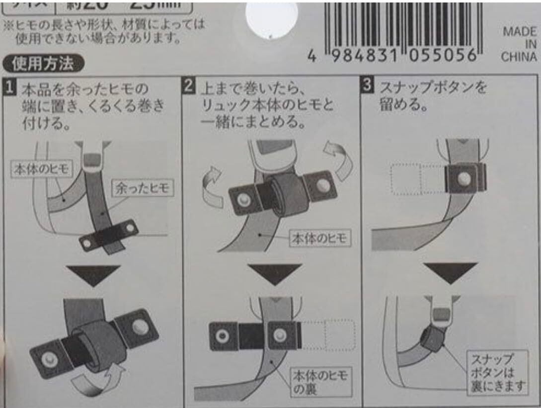 余ったヒモを切らずにまとめることができリュックのヒモが人や物にあたるのを防いでくれます。 見た目がスッキリし、置いたときに邪魔になりません。 約20~25mmの幅のヒモに対応しています。 リュックの余った肩紐をまとめてスッキリさせる便利グッズとして人気があります。