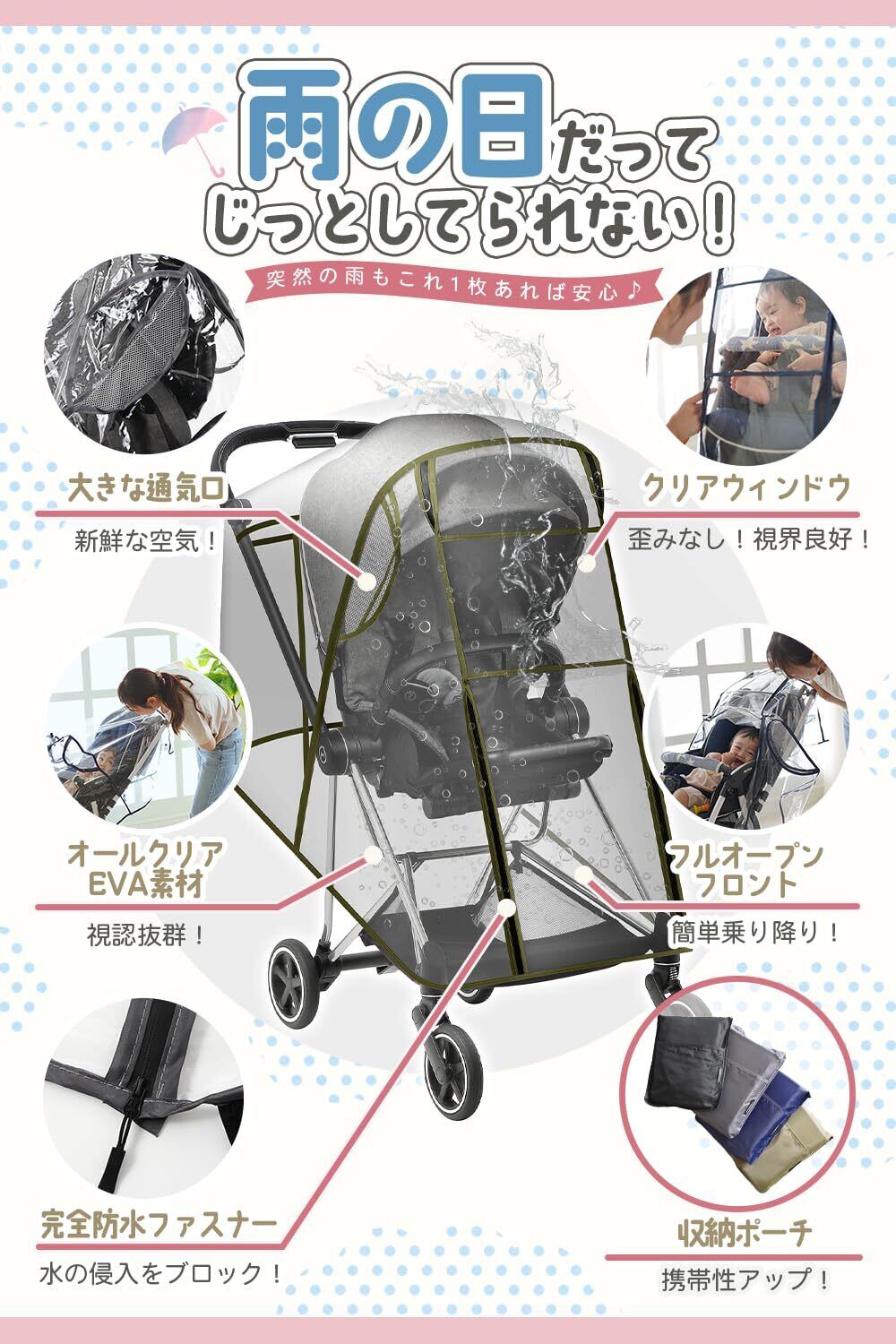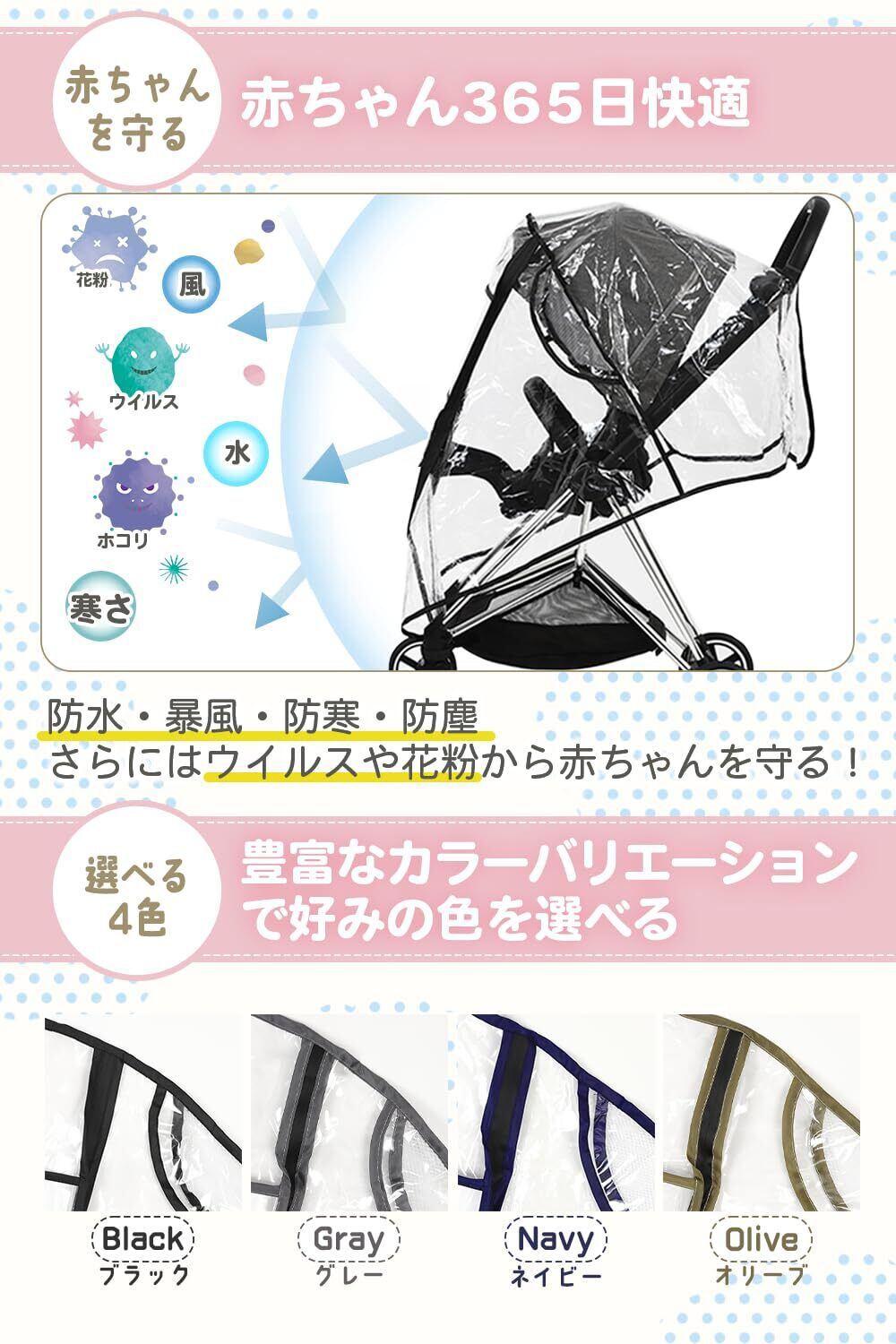 【商品仕様】ほぼ全てのA型、B型の背面式ベビーカーに装着可能なサイズになっています。重さも最適なEVA素材を使用しているため300gと軽く、付属の収納ポーチにしまいフックで引っかけられるので携帯性も抜群です。また雨の日にはもちろんですが、風や雪、寒さやほこり、花粉、ウイルスからも赤ちゃんを守ってくれるためとても汎用性が高く、レインカバー以外の使用方法も可能です。 ※EVA素材とは:耐久性、柔軟性、弾力性、耐水性に優れており、かつシワになりにくいのが特徴です。またポリエチレン素材にある独特の嫌なにおいがありません。