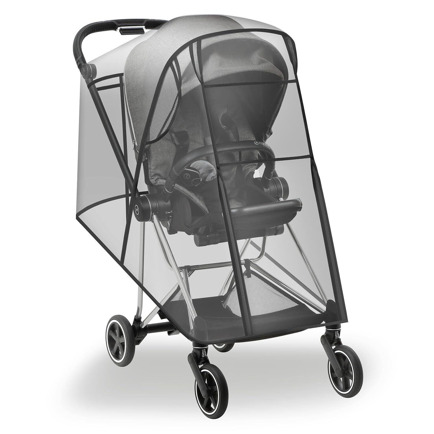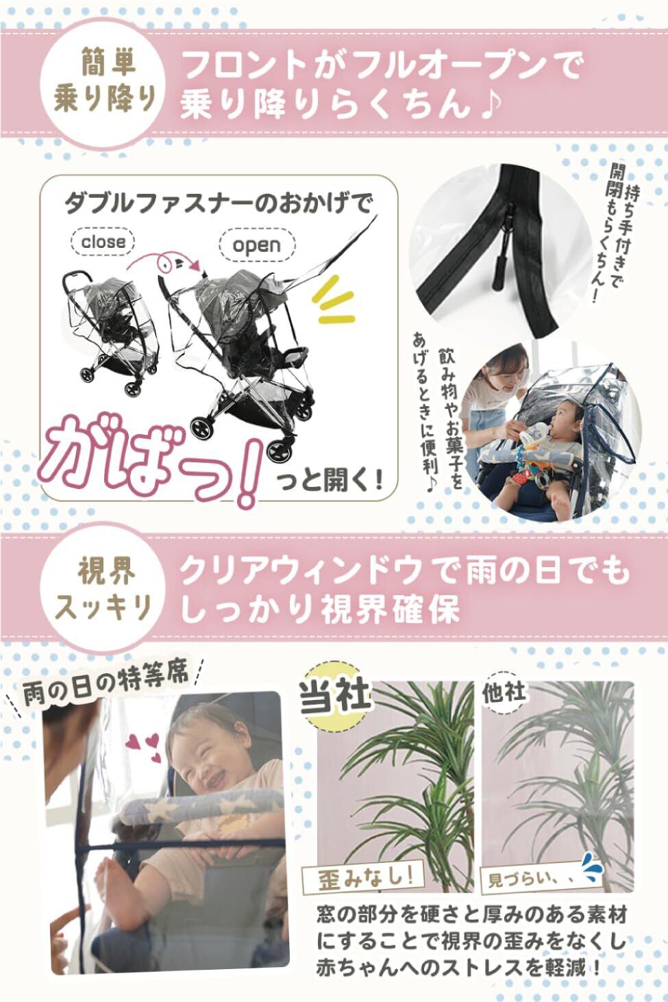 【視認性】赤ちゃん目線でも、お母さん目線でも視界は良好です。レインカバーのフロント部分にある厚さ2mm、大きさ30cmx20cmのクリアウィンドウで、まるでレインカバーをしていないかのようなゆがみのない鮮明な景色が広がります。また、全てのパーツが透明な素材のため、一回一回覗き込むことなく、チラッと見るだけで赤ちゃんの様子や、荷物の位置などが確認できます。