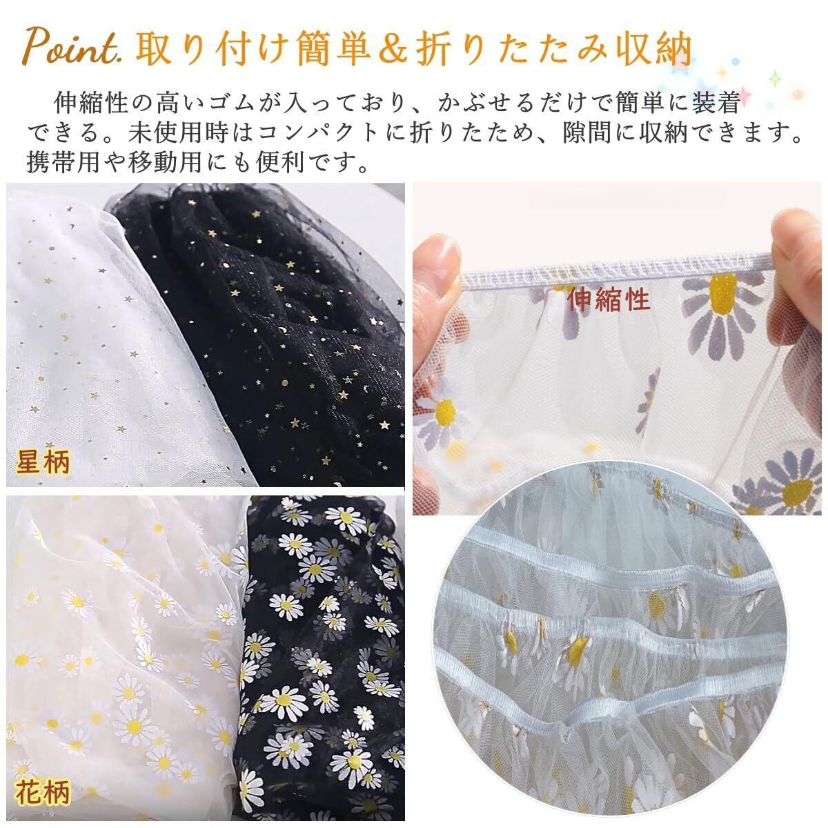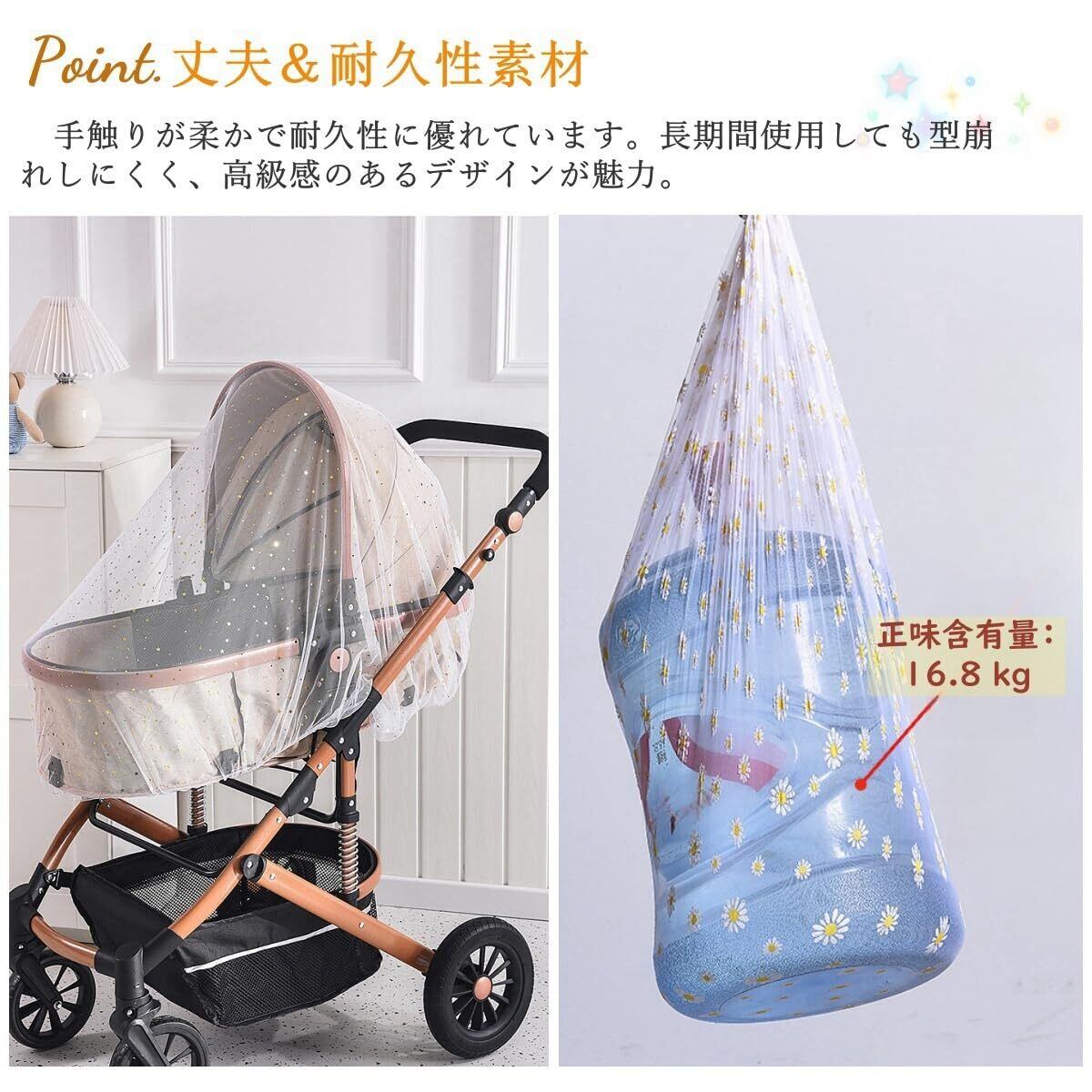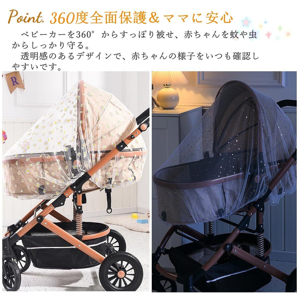 【おしゃれな星柄デザイン&男女兼用】可愛い花柄やキラキラした星柄がデザインされたおしゃれな蚊帳。シンプルかつ可愛らしいデザインで、男の子・女の子どちらのベビーカーにもぴったり。伸縮素材で各種ベビーカー対応!ギフトとしてもおすすめです。