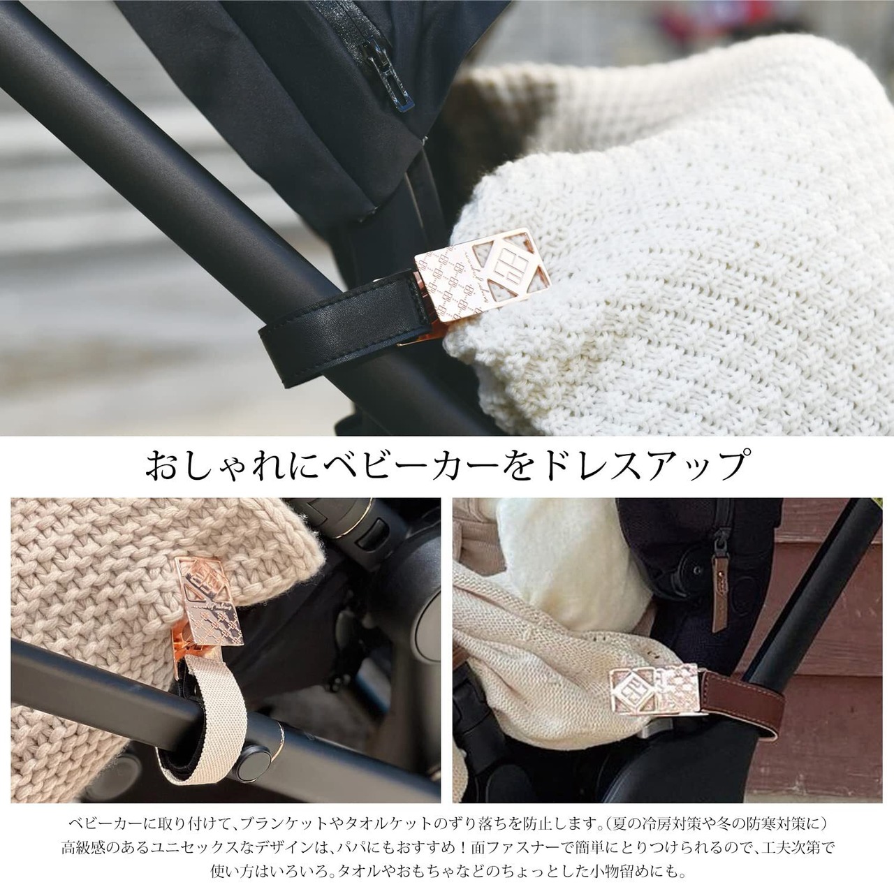 プラスチック製は壊れやすいかも…。ベビーカーにオシャレなものを付けたいなぁ… そんなママの要望から高級感のあるユニセックスなデザインで、パパにもおススメなブランケットクリップがついにリリース! ベビーカーに取り付けて、夏場の紫外線対策のタオルケットや冬場の防寒対策のブランケット等のずり落ちを防止します。マジックテープで簡単に取り付けられるので、車内等の取っ手に付けて、タオルやオモチャなどのちょっとした小物留めにもGood。お子様に当たらないような長さにしておりますが、お子様は思わぬ動作をしますので、保護者の目の届くところでご使用下さい。ベルト部分を外せば、ストラップホールがあるので好きなアクセサリーやキーホルダーを付けるとオリジナルのブランケットクリップとしても楽しめます。