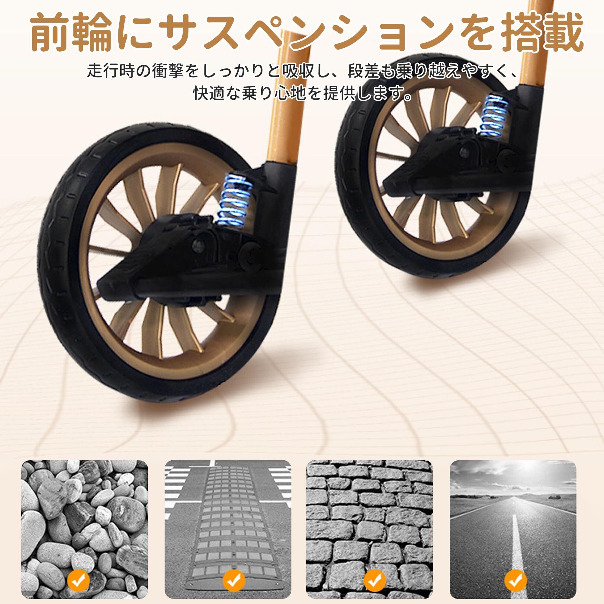 【衝撃低減システム搭載】大径タイヤ × サスペンション × ベアリング 3 重構造で段差・わずかな凹凸でも振動を吸収し、赤ちゃんの眠りを守る。ママも 1 手で簡単に方向転換可能。