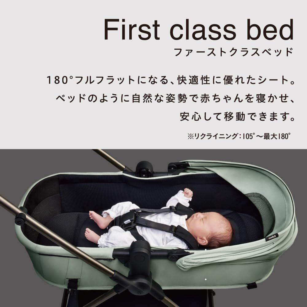 ●ファーストクラスベッド :180°フルフラットになる快適性に優れたシート。ベッドのように自然な姿勢で赤ちゃんを寝かせ、安心して移動できます。
