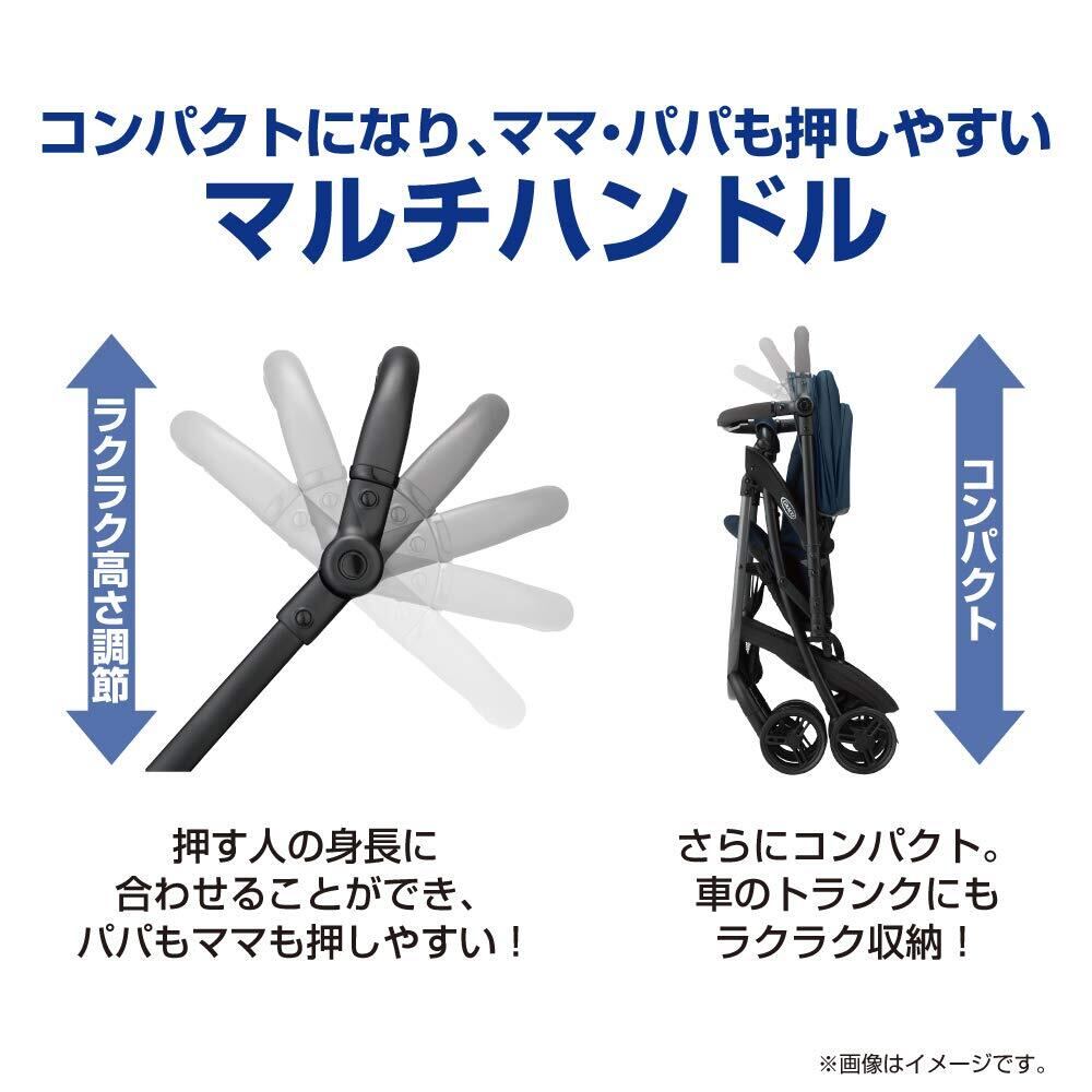 7段階に調節できるマルチハンドル搭載。ベビーカーを折りたたんだときに、よりコンパクトになり収納にも便利。走行時は身長などに合わせて角度を調節でき、ママもパパも押しやすい。