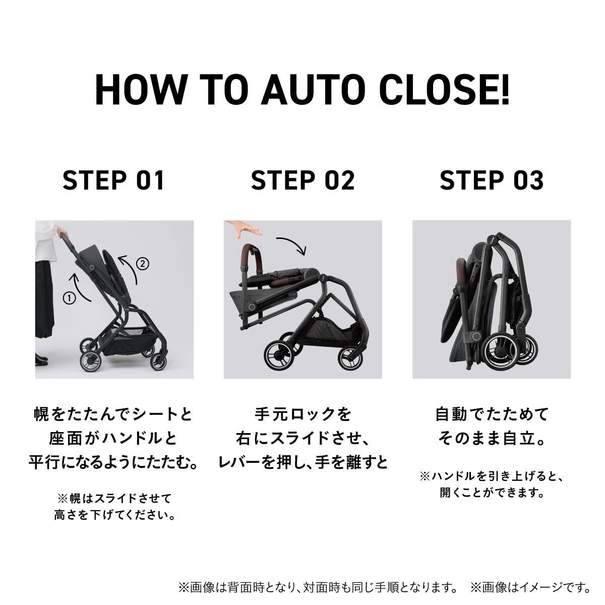 オートクローズ&オートスタンド:対面でも背面でも、レバーを握って、手を離すと自動でクローズ、そのまま自立。片手でサッとたためて、スッと動ける革新構造です。