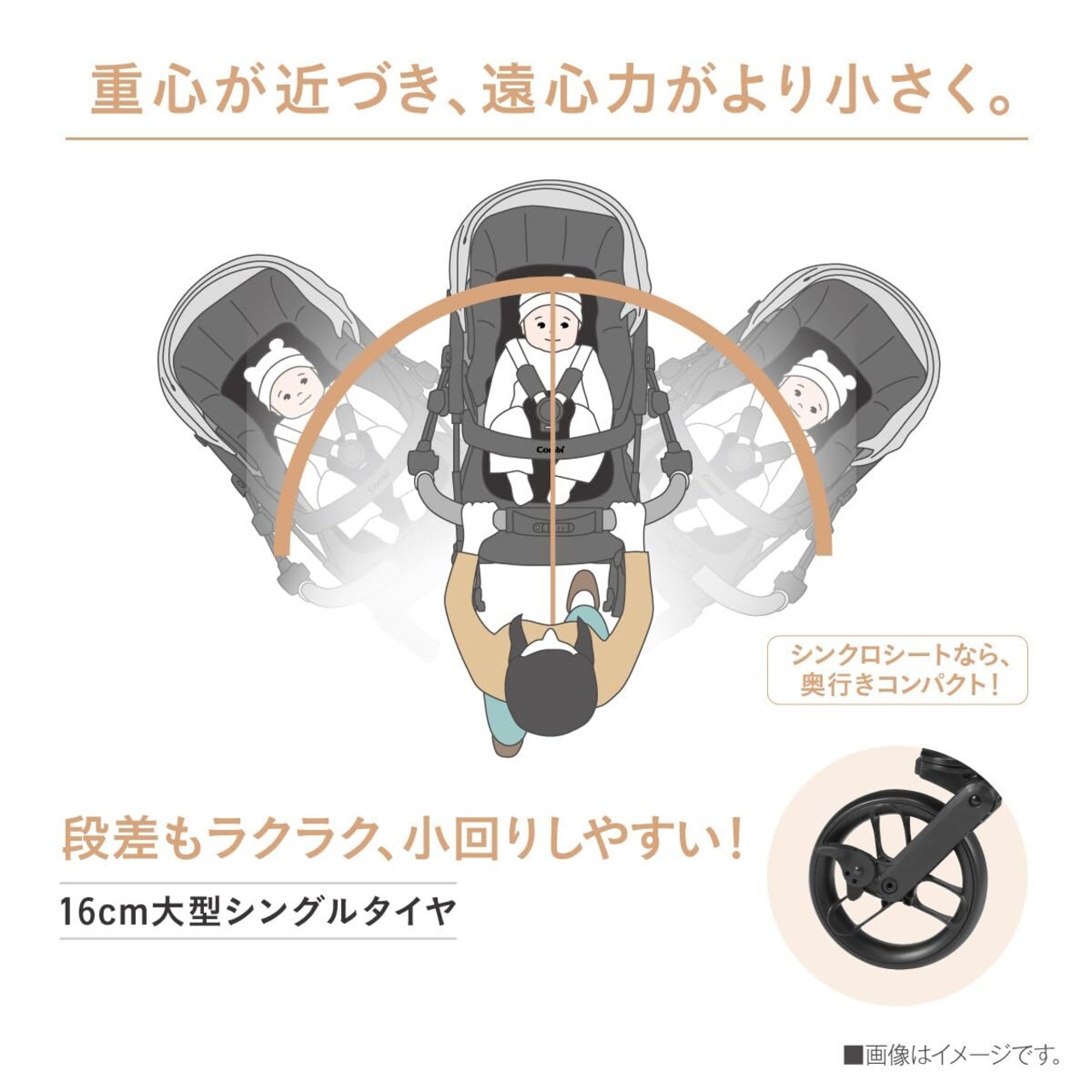 ●シンクロシート:ハンドルを切り替えると、シートが手前にスライドして、赤ちゃんがグッと近づく新構造により、しあわせなスキンシップと、スムーズな押し心地を叶えます。