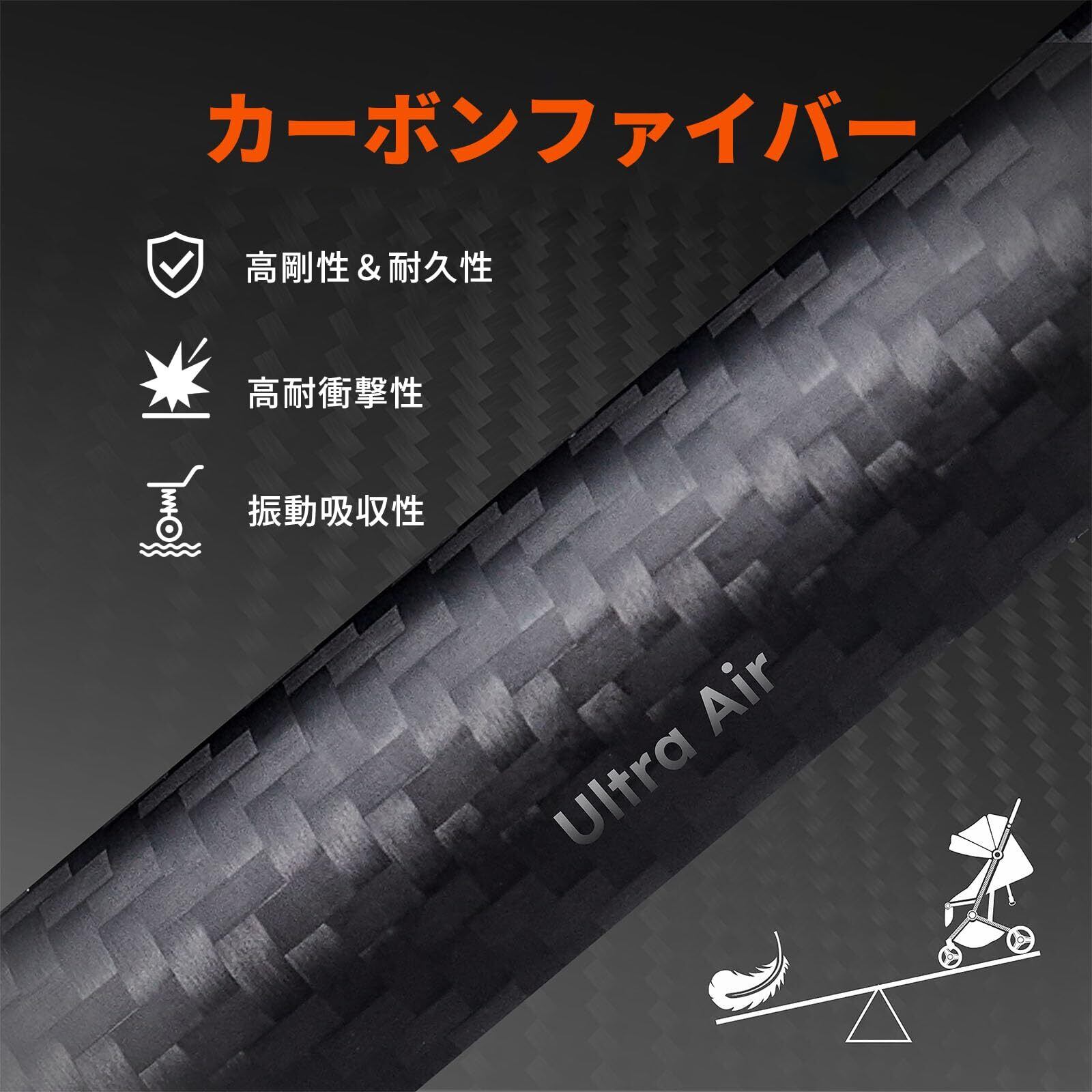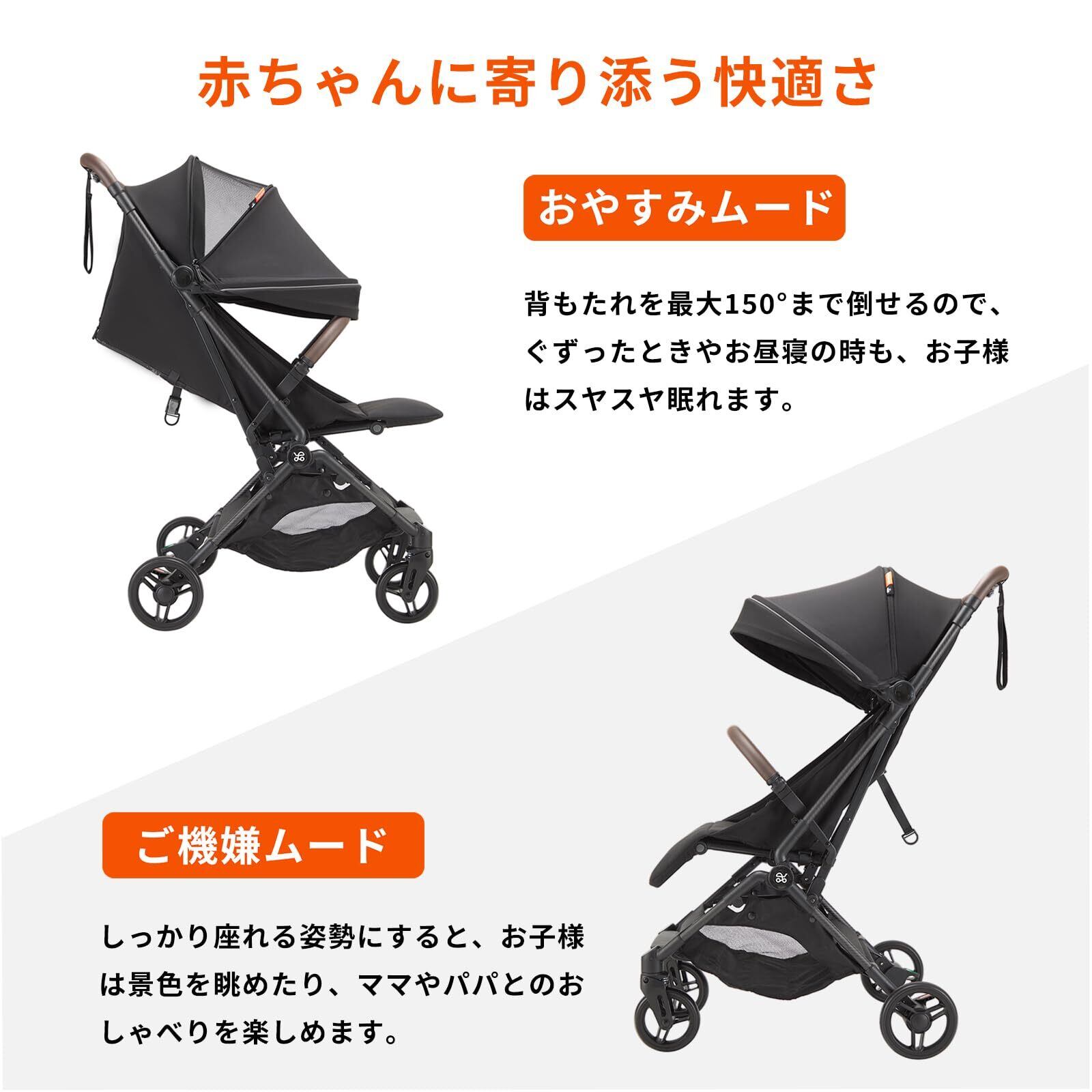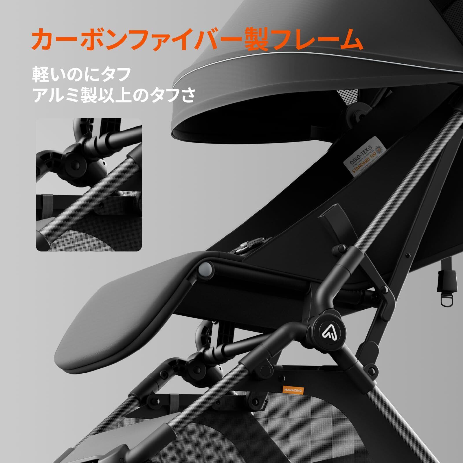 【カーボンファイバー製】ベビーカーのフレームにカーボンファイバーを採用し、一般的なアルミ製ベビーカーと比べて、軽さと強度をより高い次元で両立しています。軽量でありながら頑丈なため、軽快かつ安定した走行性を備え、お子さまに快適な乗り心地をしっかりと提供します。