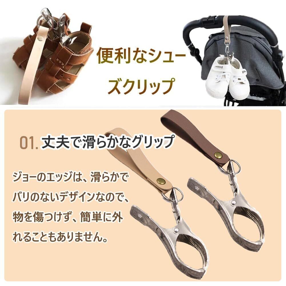 パッケージ内容:ベビーカー用シュークリップ×2個、アプリコット色とブラウン色があります。
