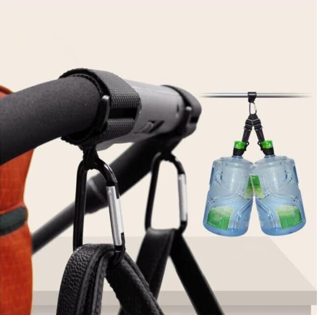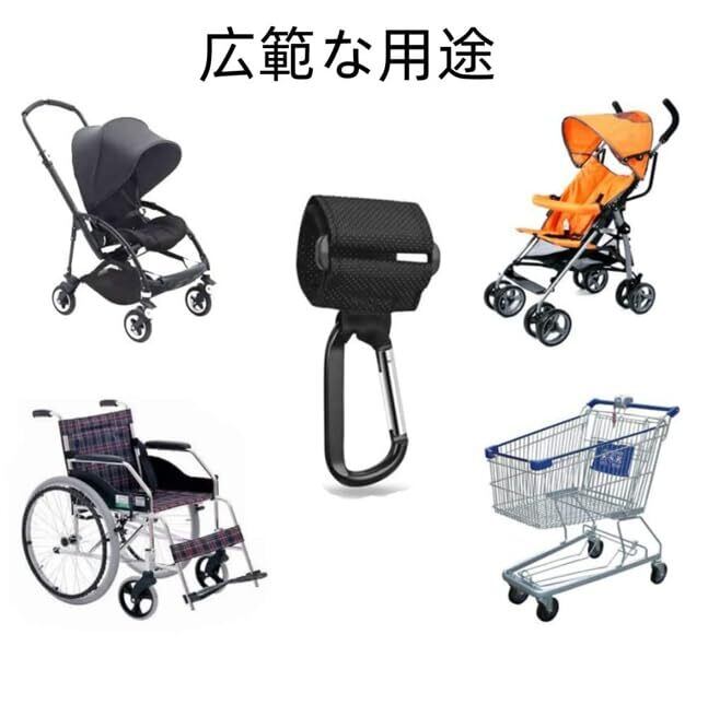 【在庫セール】ベビーカー フック 荷物フック 2個セット ブラック 360度回転カラビナロックフック 多機能フック 車用 フックマジックテープ式 調節可能な サイズ 滑り止め 丈夫 耐荷重30kg