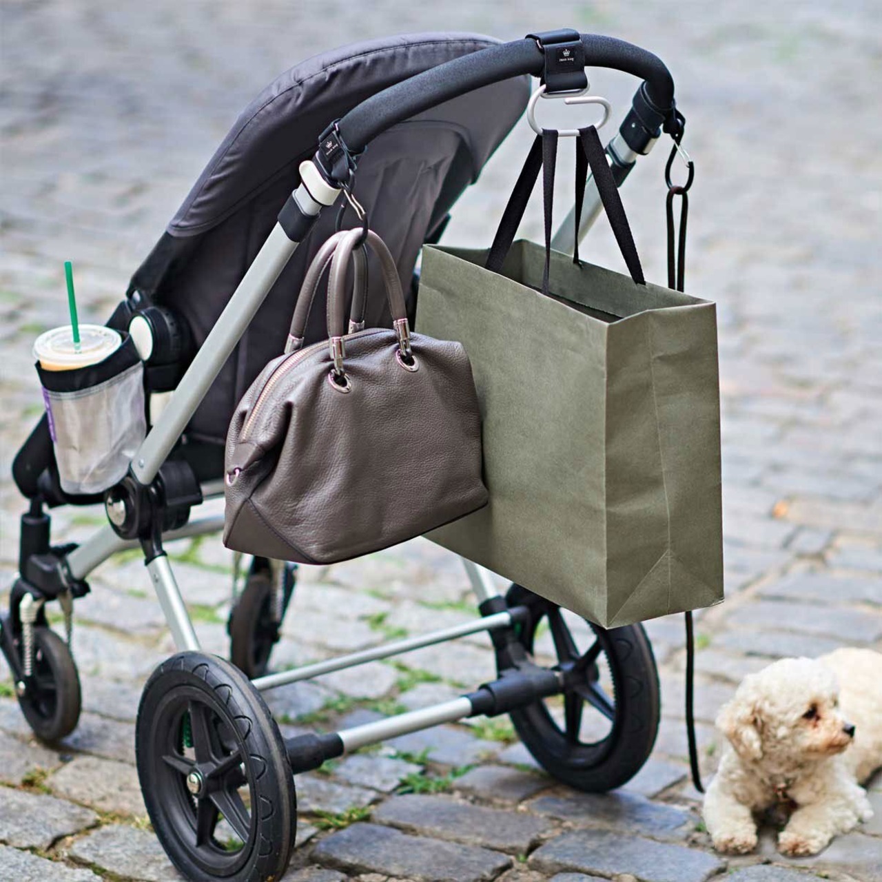 ※転倒の危険がありますので、お子様をベビーカーから降ろす前に必ず掛けたモノをフックから取り外してください。また、重すぎるモノは掛けないでください。