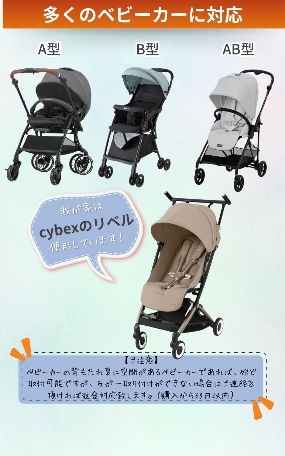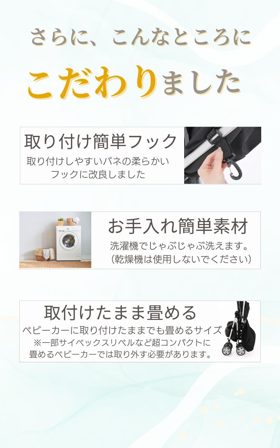 【イージー取り付け】どんなベビーカーにも簡単に取り付け可能。マジックテープでしっかり固定され、裏面には滑り止め加工がされているので安心です。