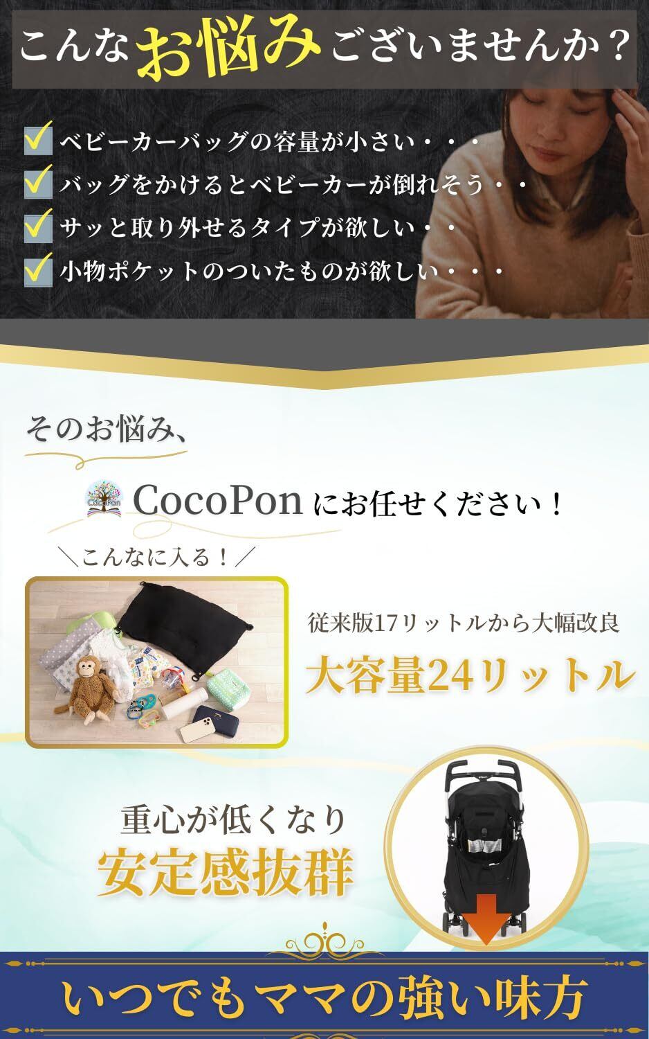 【特価セール】CocoPon ココポン ベビーカー アンダーバッグ 【便利なチャック付き収納ポケット&トートバッグに変身】 倒れない トートバッグ 収納 大容量 24L (ブラック)