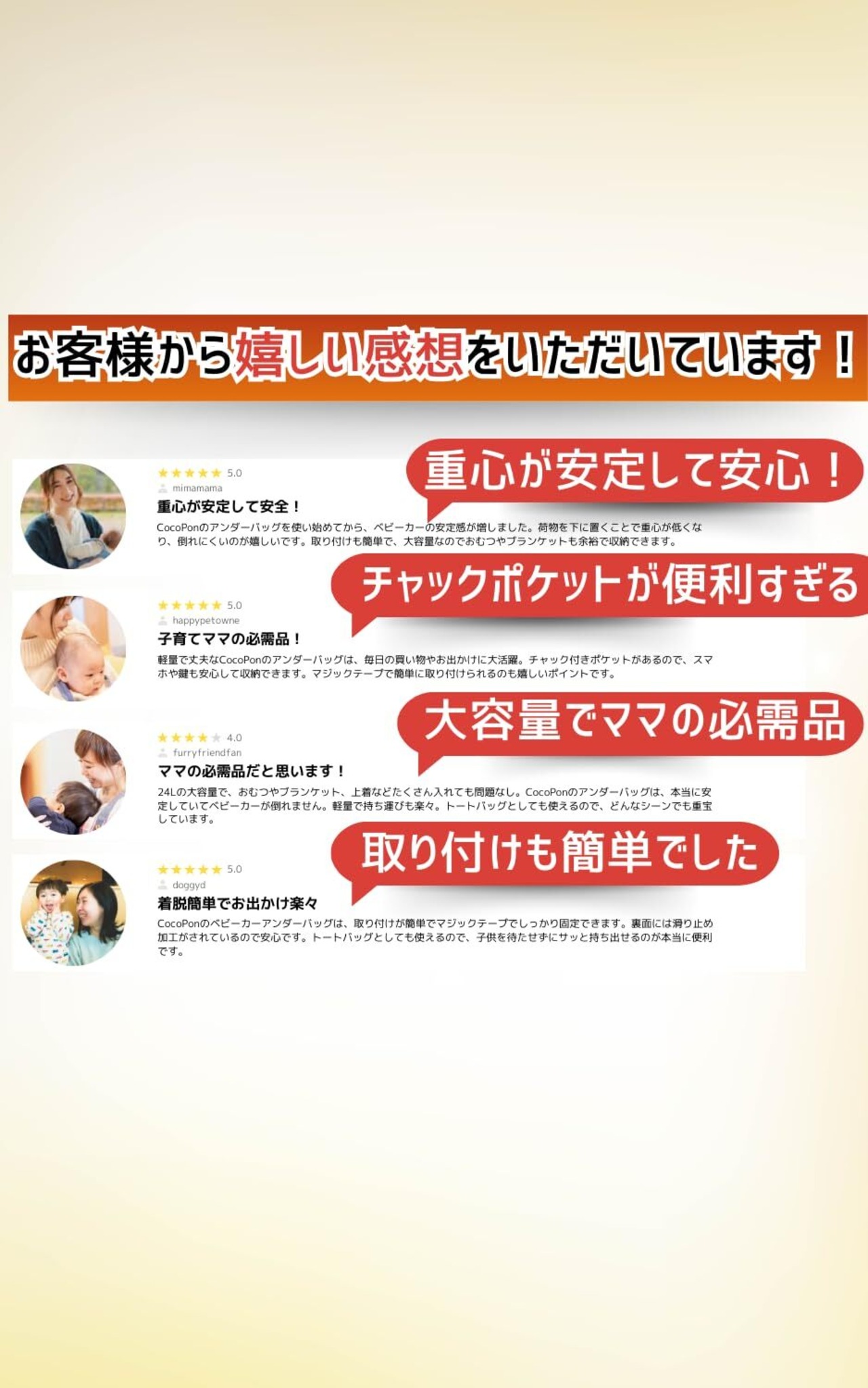【あっという間にトートバッグに変身】 CocoPon(ココポン)のベビーカーアンダーバッグの特徴は、あっという間にでアンダーバッグがトートバッグに変身すること!着脱スムーズで、お子様を待たせずにサッと持ち出せます。