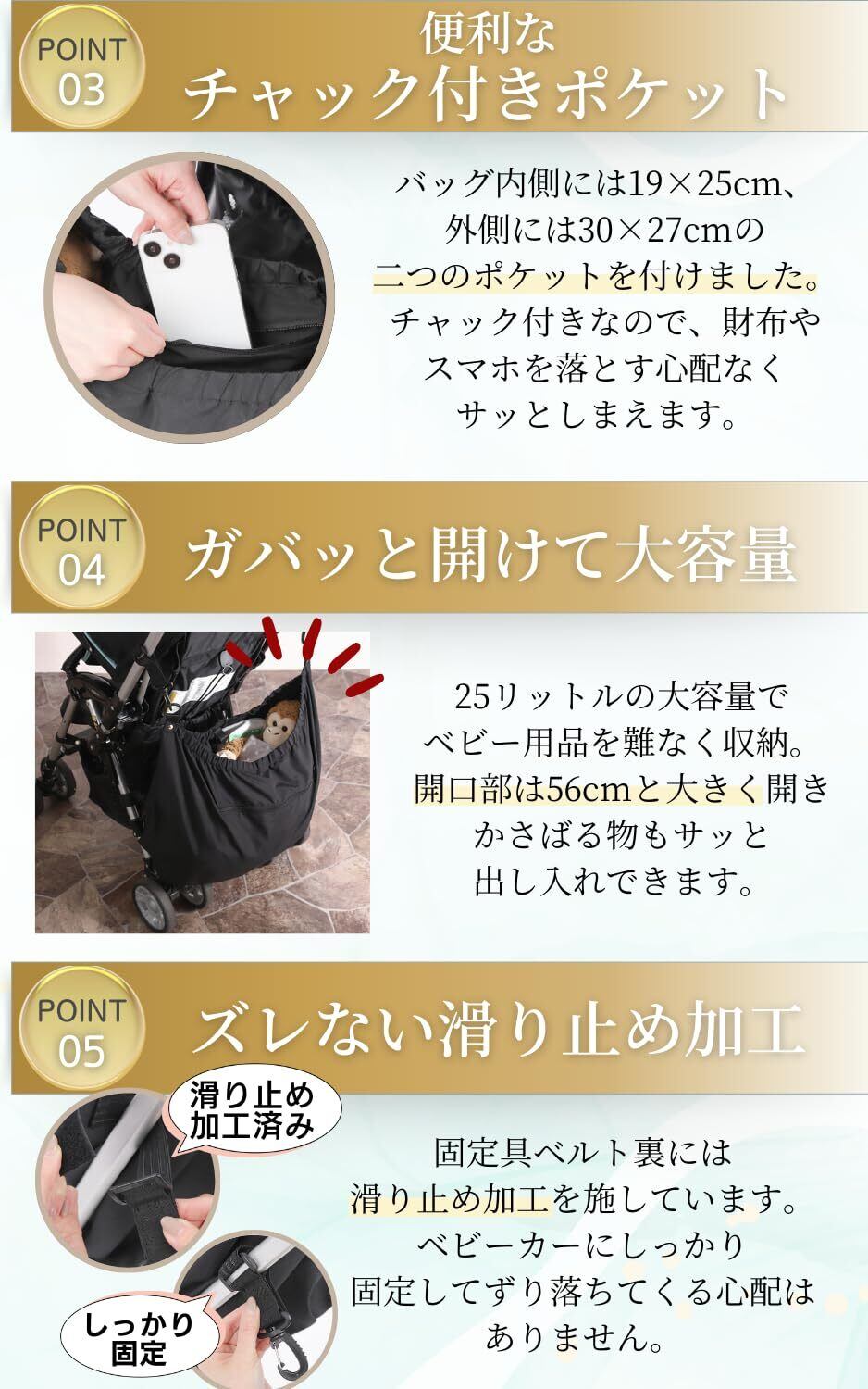 【たっぷり収納24L収納】大容量24リットルのサイズで、かさばる上着や抱っこ紐、ブランケットなど、たくさんのお世話グッズが収納可能。荷物が多くても倒れにくい安定性が嬉しいポイントです。