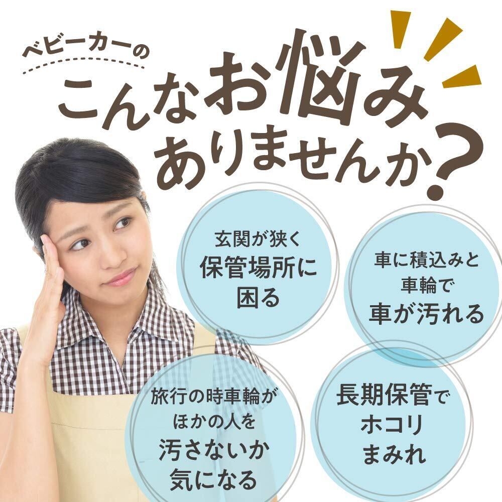 【 汚れ防止 】旅行などの移動中は、タイヤの泥で周りの人や社内を汚すのを防止します。袋に持ち手がありますので、持ち運びもらくらくです。自宅保管の場合は、ホコリや日焼けからベビーカーを守ります。