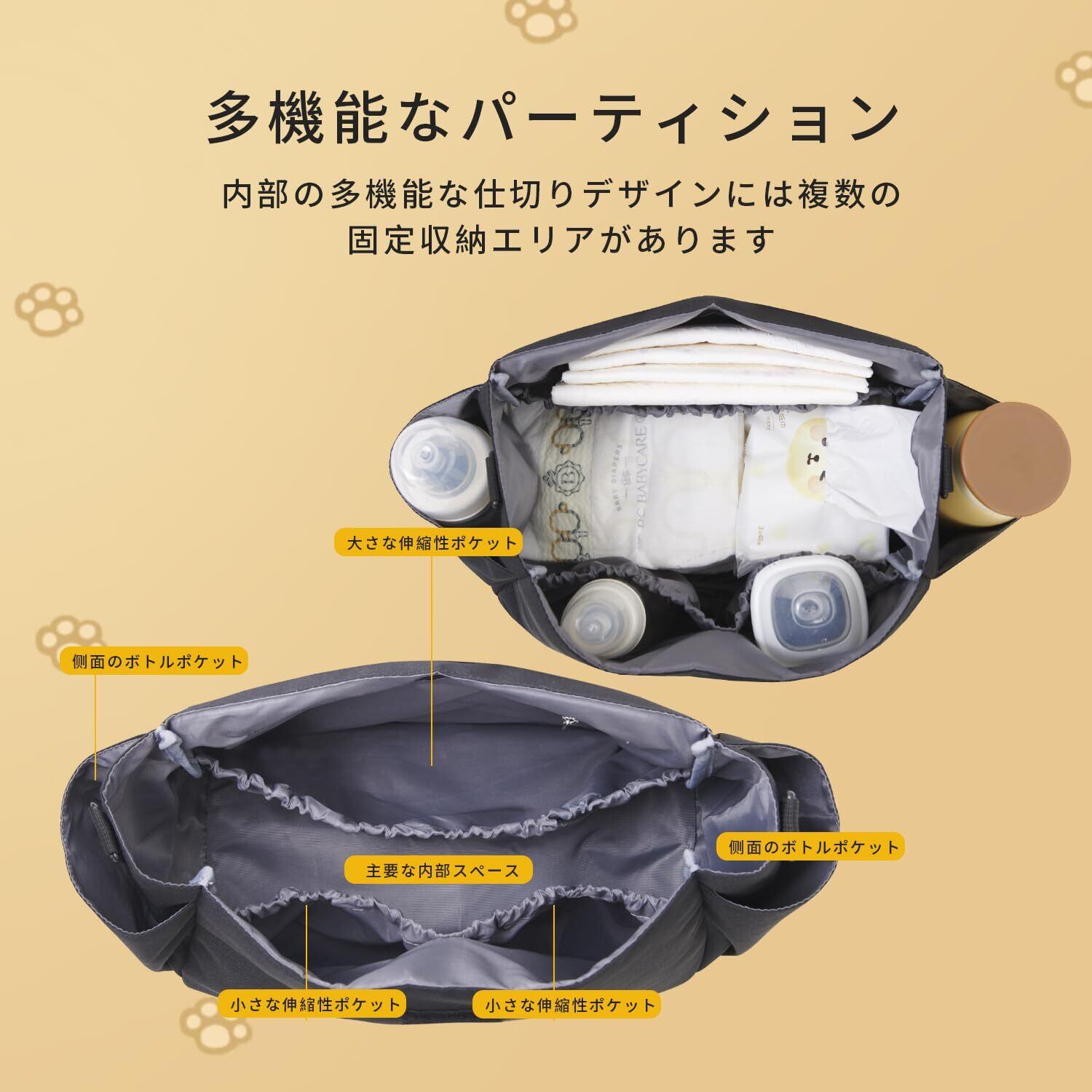高品質:当社のベビーカーオーガナイザーは高品質な600Dオックスフォードクロス生地で作られており、洗いやすい内側の裏地で、赤ちゃんに安全です。しっかりと縫われ、耐久性があり、防水性があり、軽量です。ブラック、イエローの2色で利用可能です。