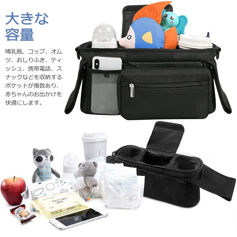 【特価セール】HEARTST ベビーカー用バッグ 大容量 ベビーカー用バッグ ドリンクホルダー ベビーカーバッグ 撥水 多機能 保温 保冷 調節可能 ベビーカー ドリンク ホルダー おむつポーチ 哺乳瓶 スマートフォン ベビーカーフック2個付 (ブラック)
