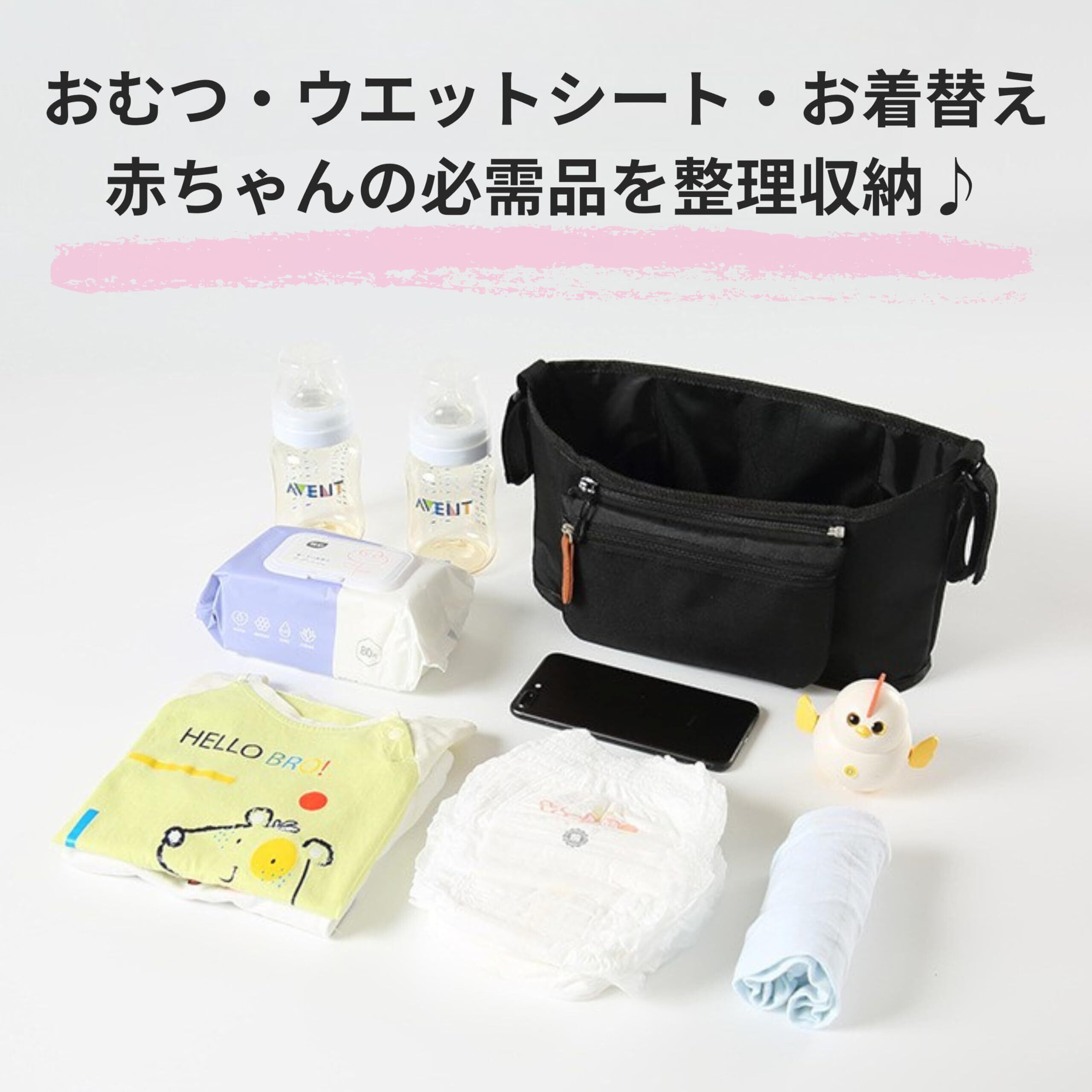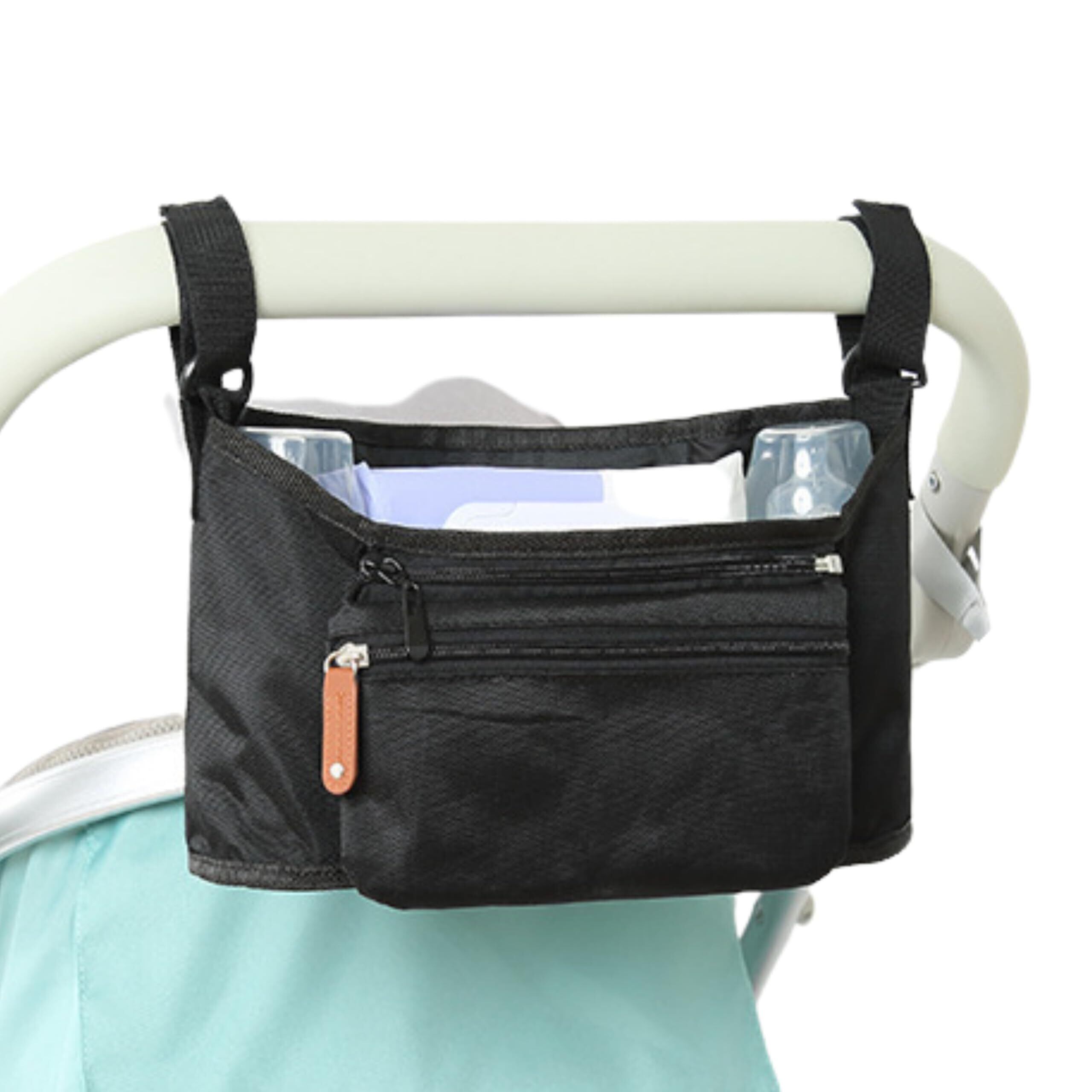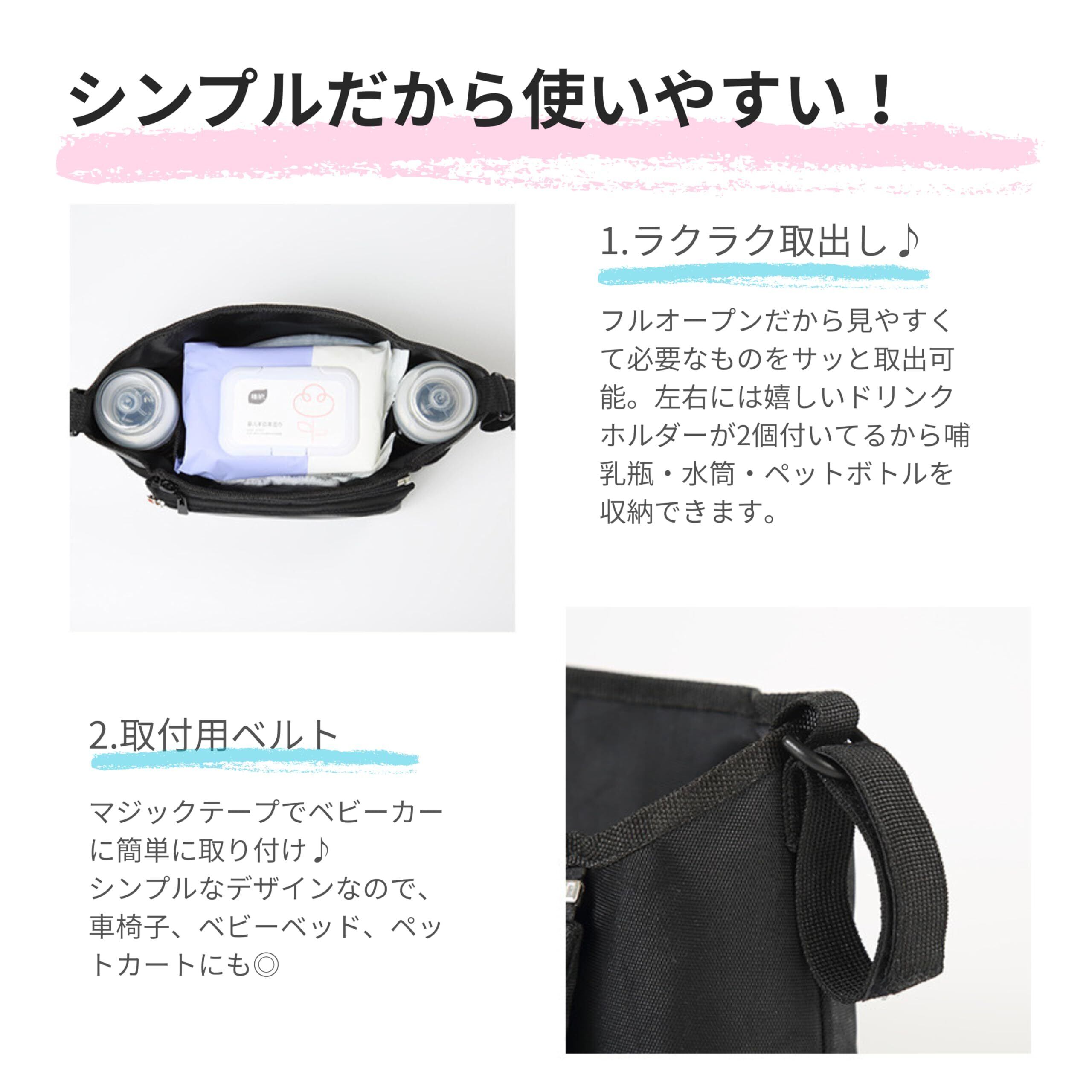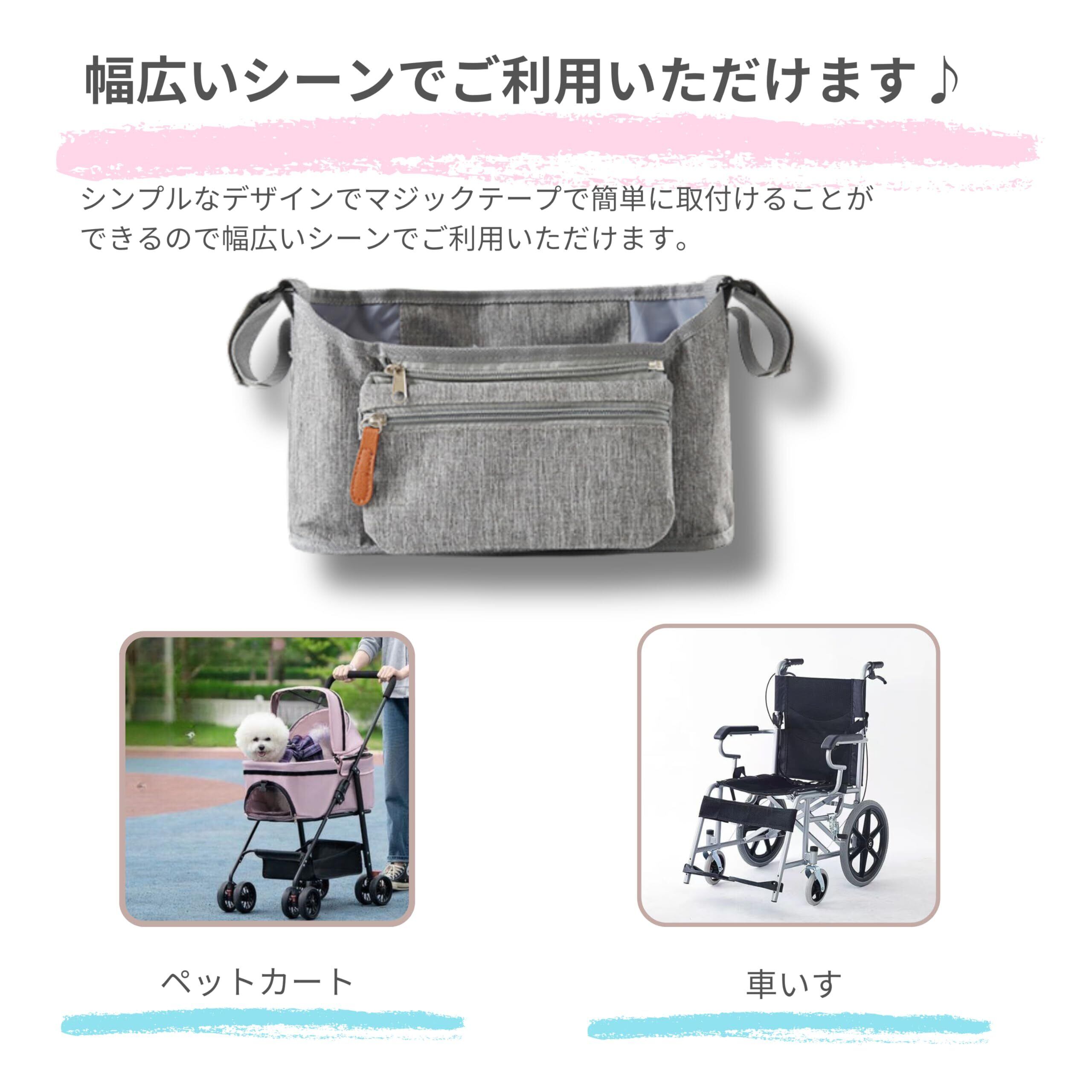 【簡単取り付け】ベビーカー掛け専用バッグ マジックテープ留めで簡単取り付け。車椅子、ベビーベッド、ペットカートにも対応し、取り外しも簡単です。