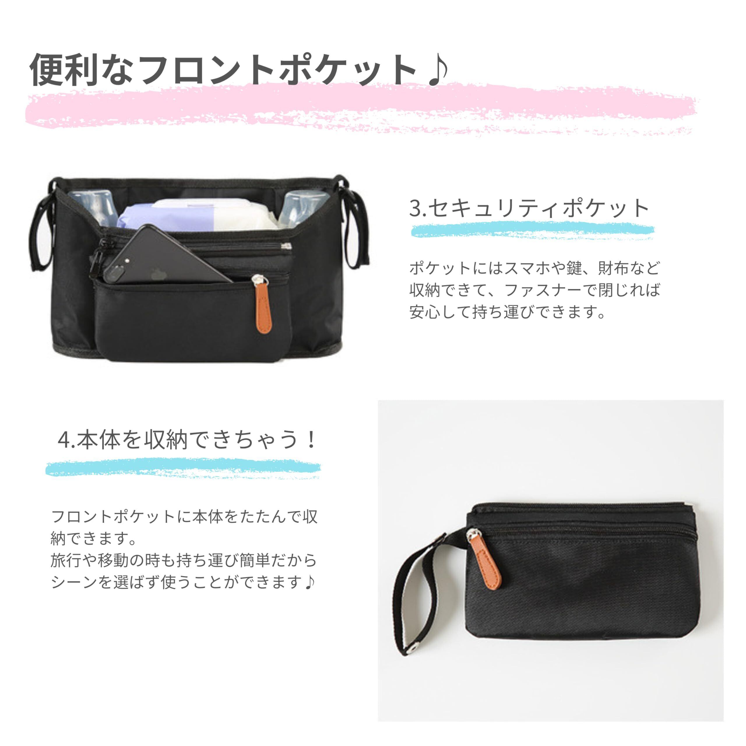 【在庫処分】PURUMACA ベビーカー用バッグ ドリンクホルダー2個 おむつポーチ 哺乳瓶 多機能 撥水 ウェットティッシュ ベビーカー掛け スマートフォン コンパクト 畳める (ブラック)