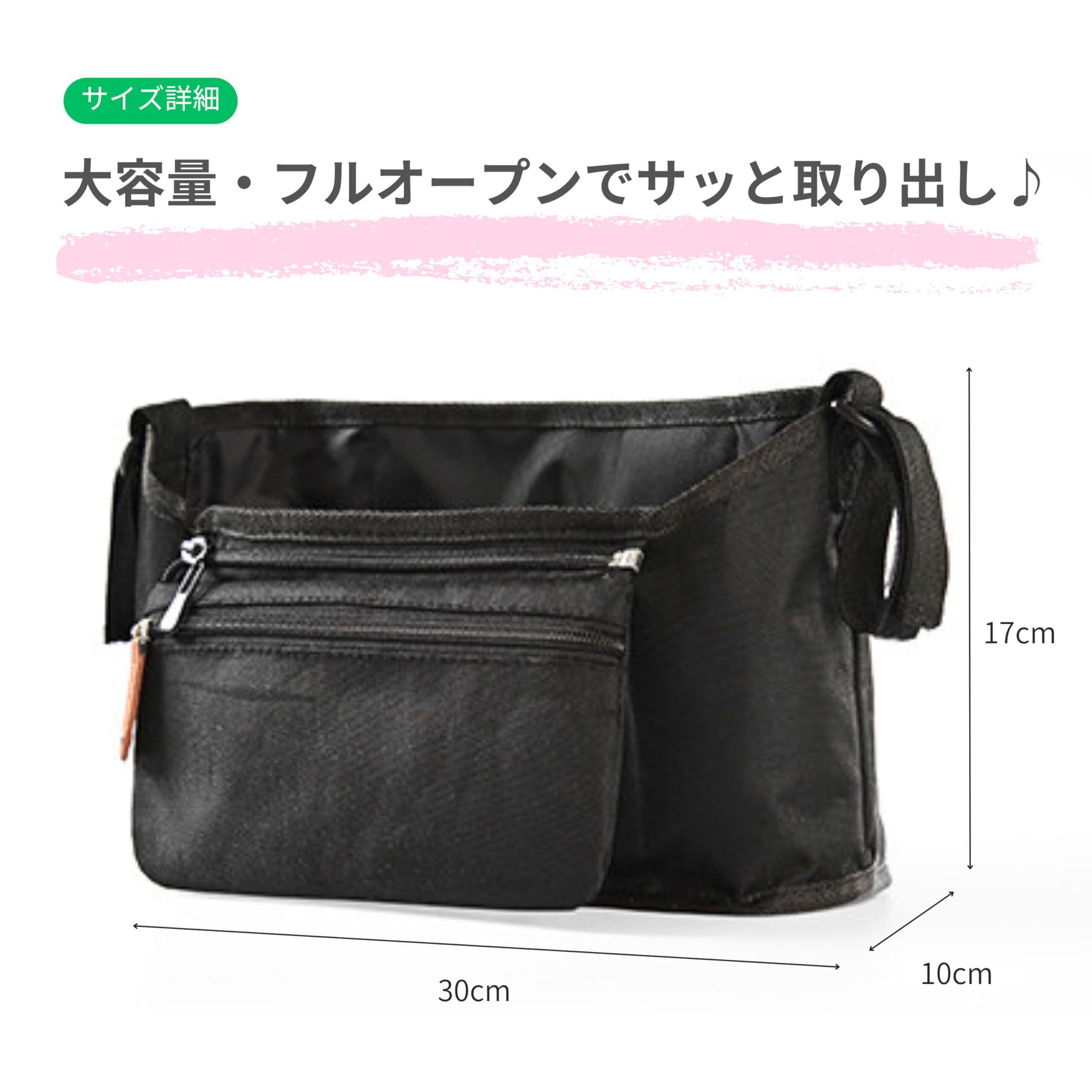 マジックテープ留めでベビーカーに簡単に取り付けでき、取り外しもスムーズです。車椅子やベビーベッド、ペットカートにも対応しており、用途に合わせて幅広くお使いいただけます。 メイン収納は口が大きく開くフルオープン型で、おむつ、おしりふき、お着替え、ハンカチなど赤ちゃんの必需品を見やすく整理できます。中身が確認しやすく、必要なものを素早く取り出せます。 ドリンクホルダーを二つ備え、哺乳瓶や水筒、ペットボトルを安定して収納できます。取り外し可能なチャック付きプライバシーポケットも備え、貴重品を分けて持ち運べます。 素材は撥水性に優れたナイロン生地で、雨や汚れに強く、さっと拭き取るだけでお手入れが簡単です。摩擦に強く耐久性にも優れており、長くご使用いただけます。サイズは30×10×17cm、重量は約170gです。 日本企画による安心の品質で、30日間の保証付き。万が一の不具合が発生した場合も迅速に交換・返品対応を行い、日本語のアフターフォロー体制も整っています。