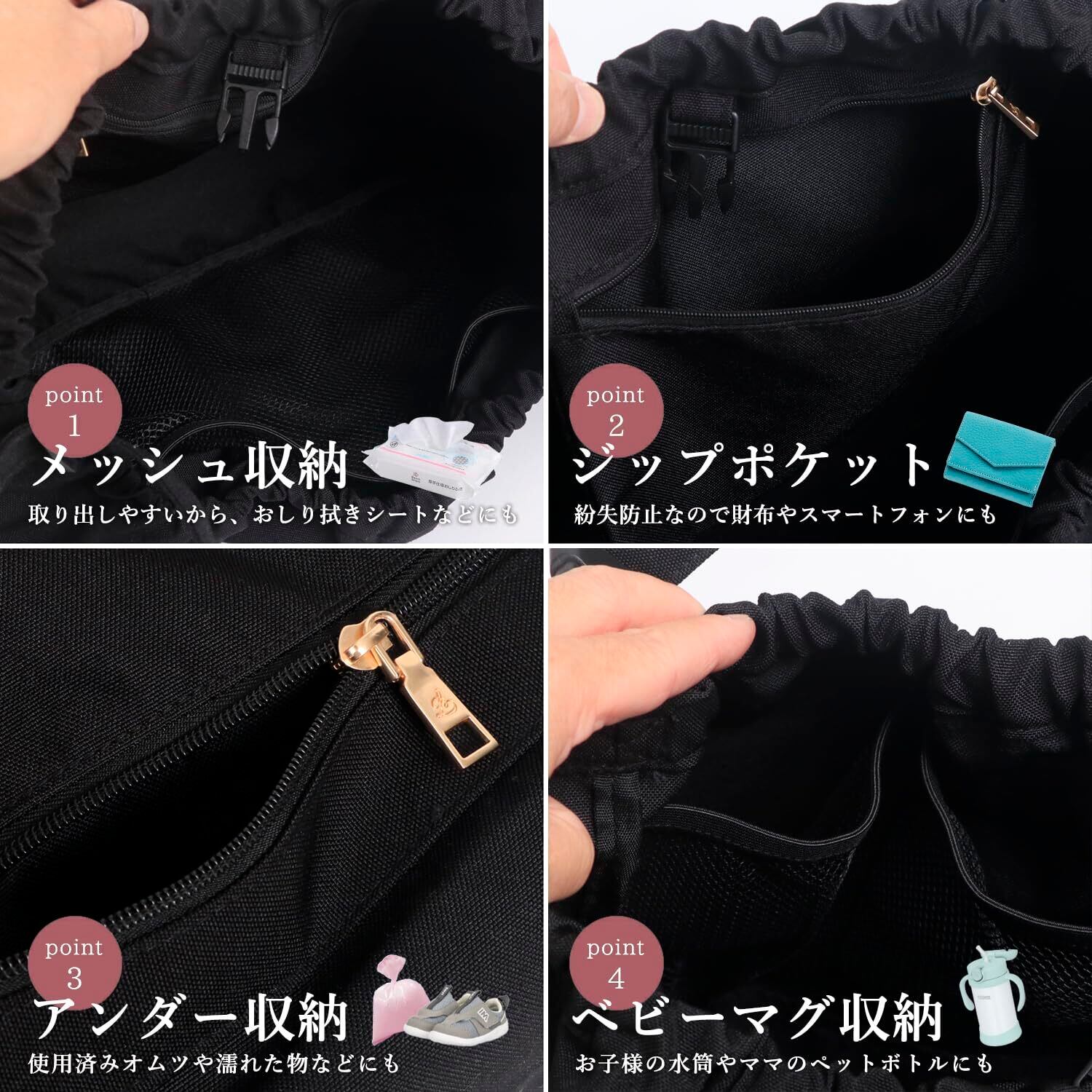 ●大容量収納 おむつ、哺乳瓶、着替え、タオルなど必要なアイテムをたっぷり収納可能。 小分けポケットが多いから便利で探し物がすぐ見つか時短に。 伸縮性のあるゴムタイプでかさばる荷物をさっと出し入れ楽々!