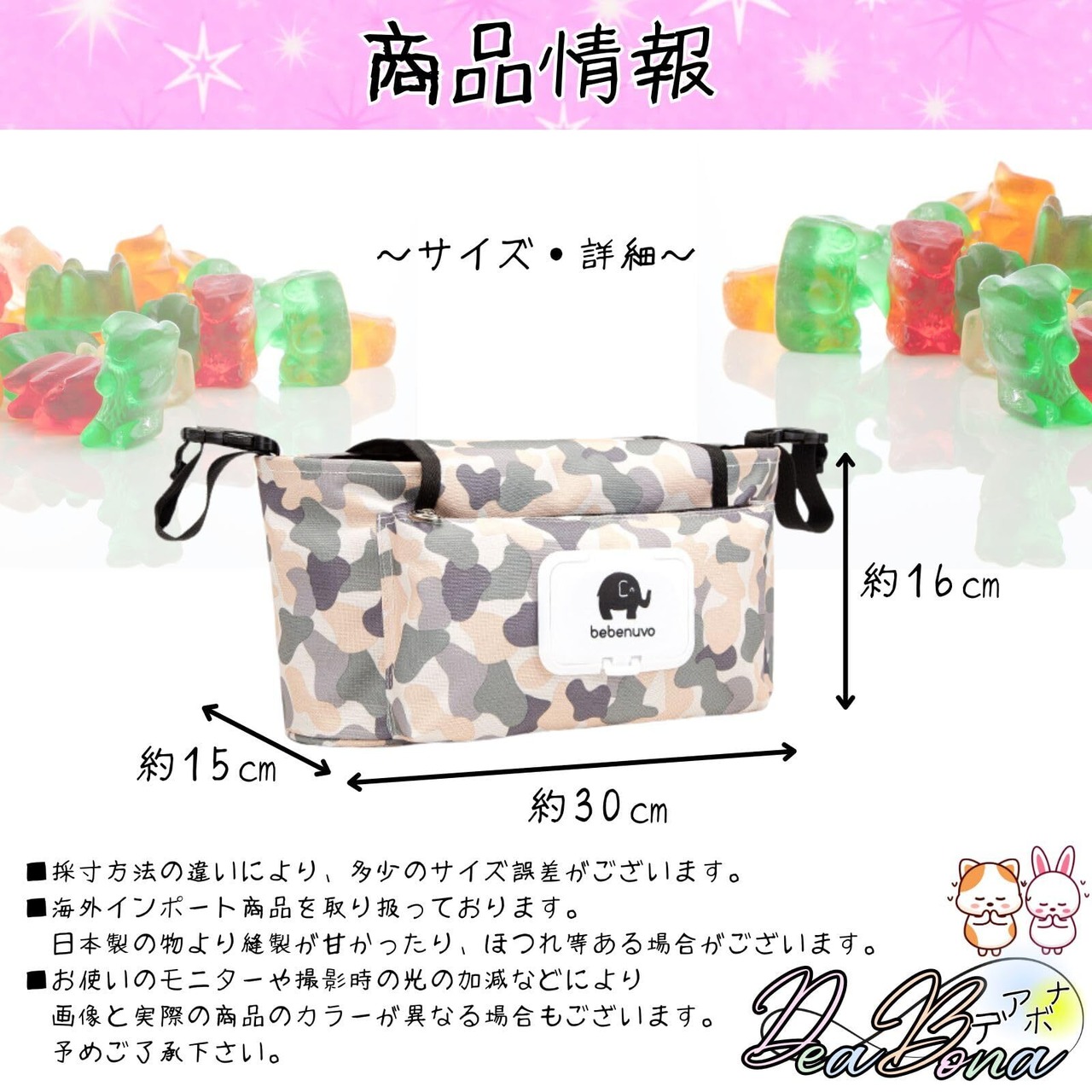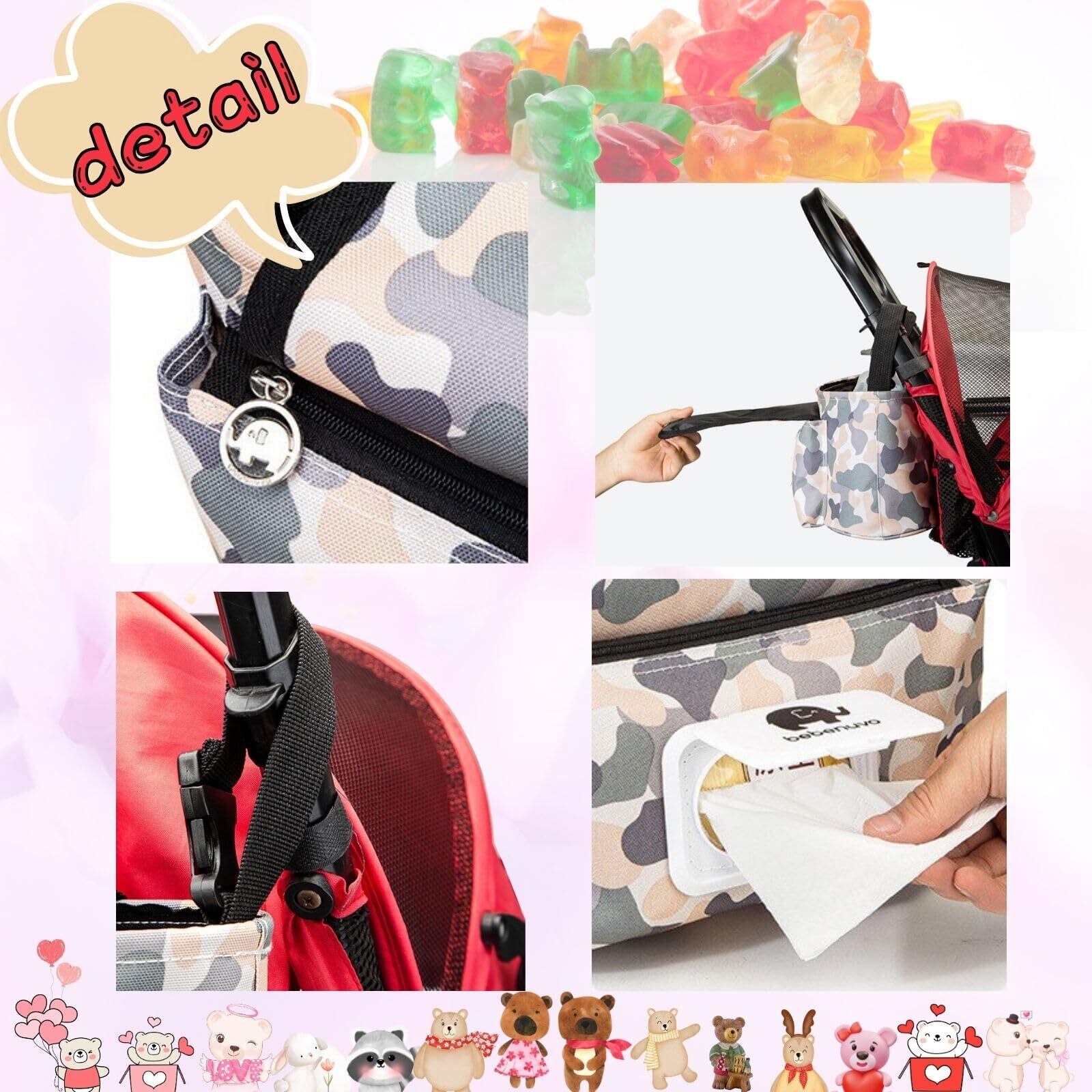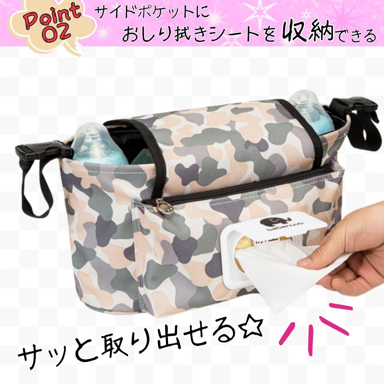 サイドポケットにおしり拭きシートを収納できサッと取り出せます。