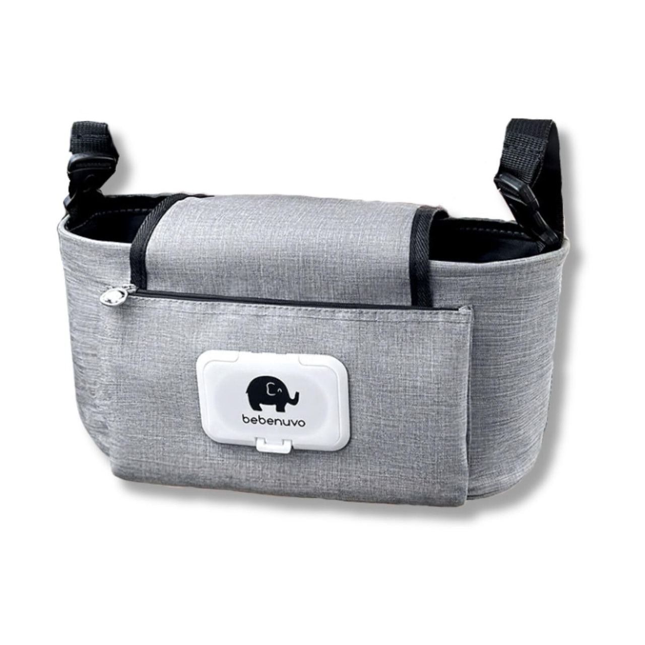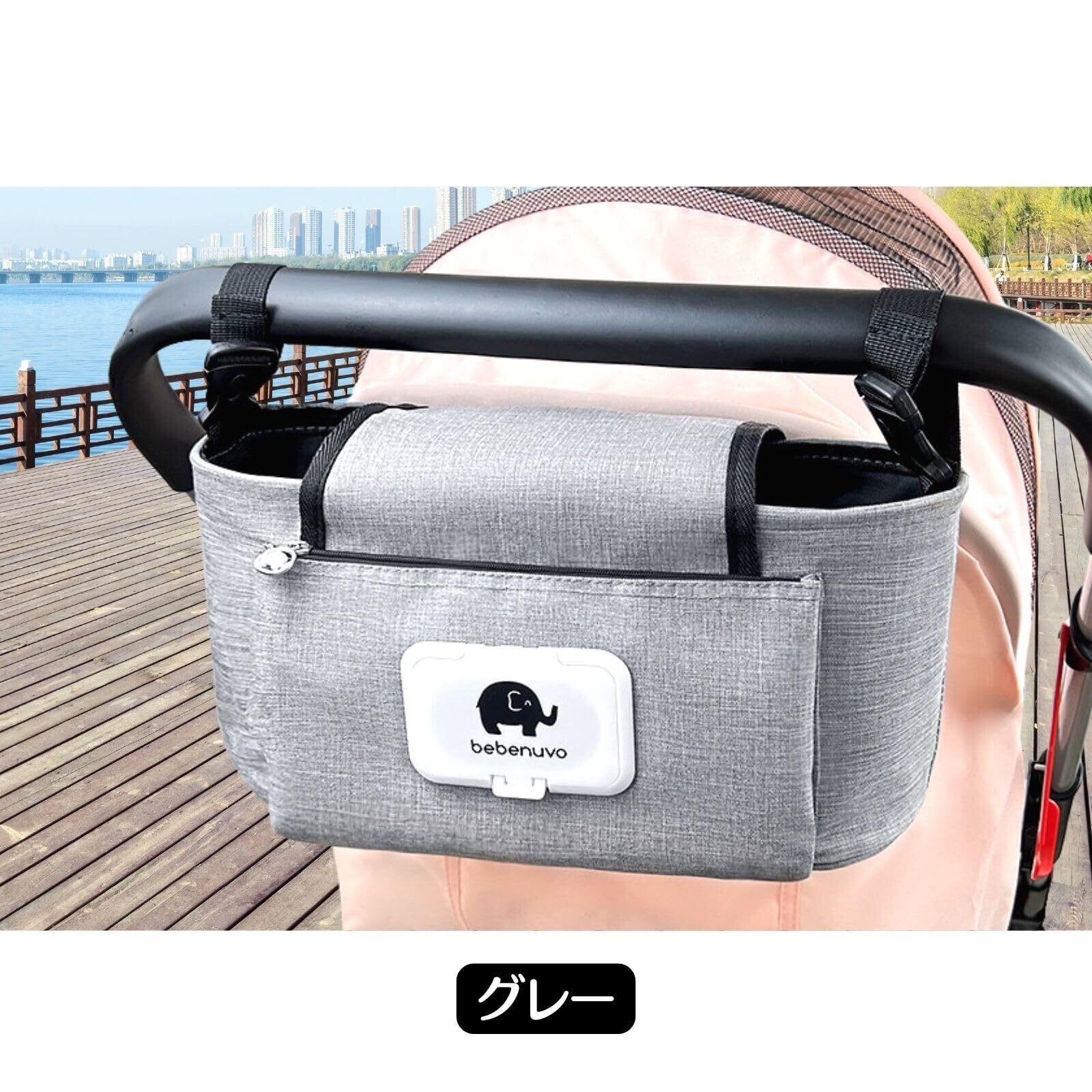 ベビーカー バッグ おむつ入れ ドリンクホルダー おしり拭き ウェットティッシュ ワンタッチベルト バギー カート 大容量 多機能 収納 (グレー)
