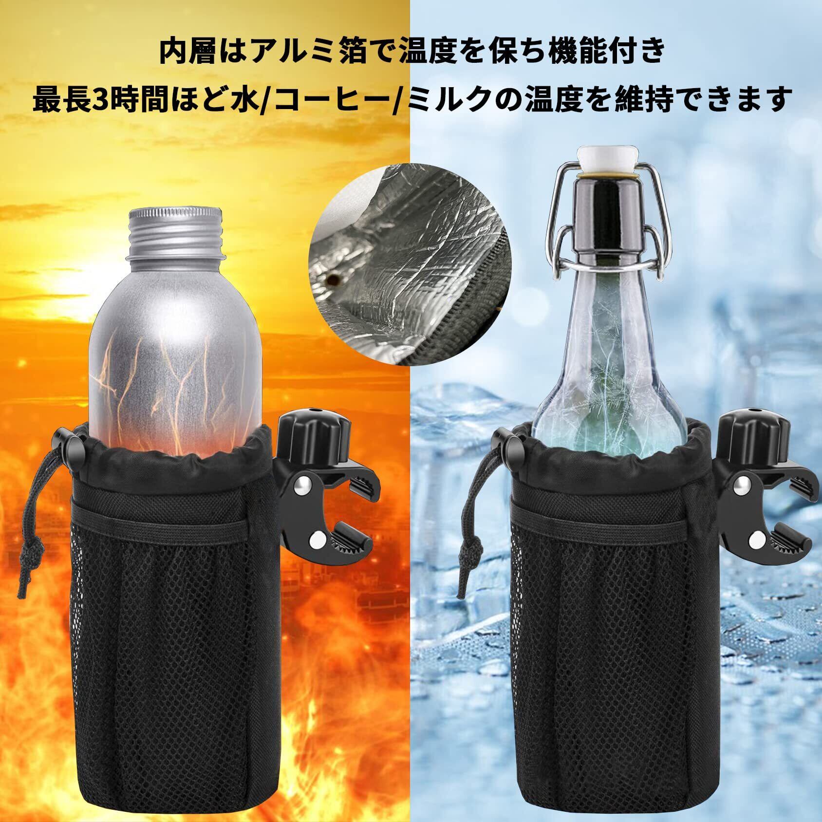 【ドリンクホルダーとして大役立】サイズ:円周約10cm*高さ18cm(直径8.5cm以内のボトル対応可能)、外径1.5-4.4cmの横棒、縦棒、角棒、丸棒を問わずに固定できます。様々な場合でも対応できます。そして内層はアルミ箔で断熱設計採用しており、温度維持の機能が実現します。暑い夏に大麦茶など飲み物を長時間冷たく保ち、寒い冬にコーヒーを暖かく保つのは最高です!水/コーヒー/ミルクなど飲み物の温度は最長3時間ほどキープできます。