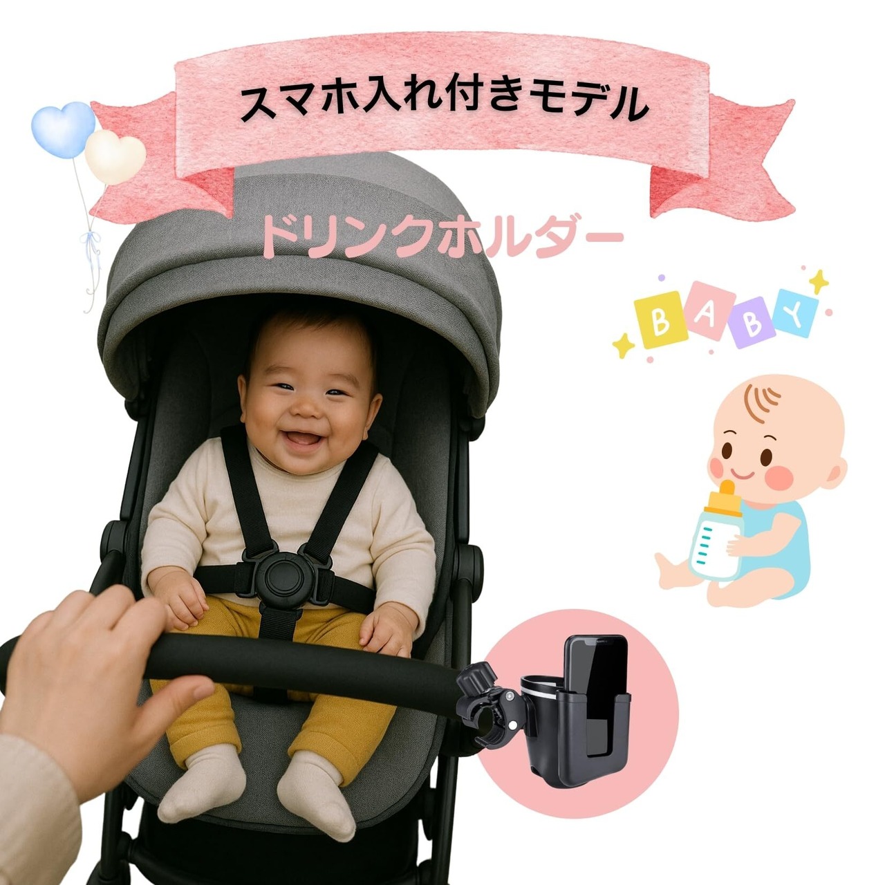 ベビーカー ドリンクホルダー 自転車 カップホルダー 360度回転 滑り止め 取り付け簡単 哺乳瓶 ペットボトル対応 多機能 ホルダー (スマホ入れ有り)