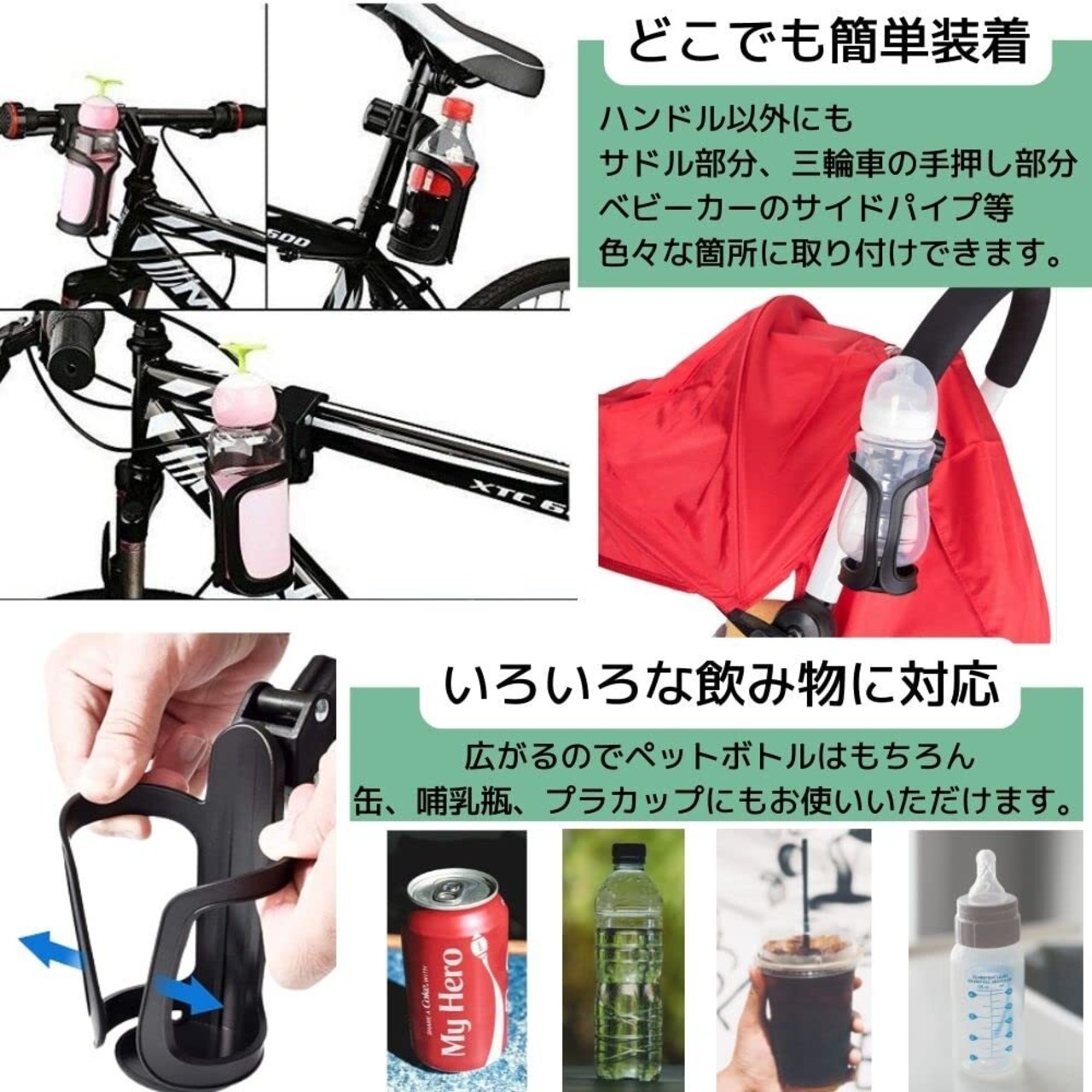 【新春セール】East Leaf ドリンクホルダー 自転車 ハンドル ボトルホルダー ペットボトル 工具不要 2個 セット 黒 ベビーカーにも