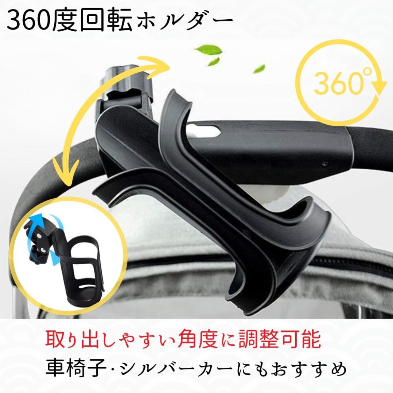 【360度回転ホルダー】角度を自由に決められるドリンクホルダー。360度の回転が可能だから、取り出しやすい角度に調整OK。車椅子やシルバーカーを使用されている方にもオススメ。